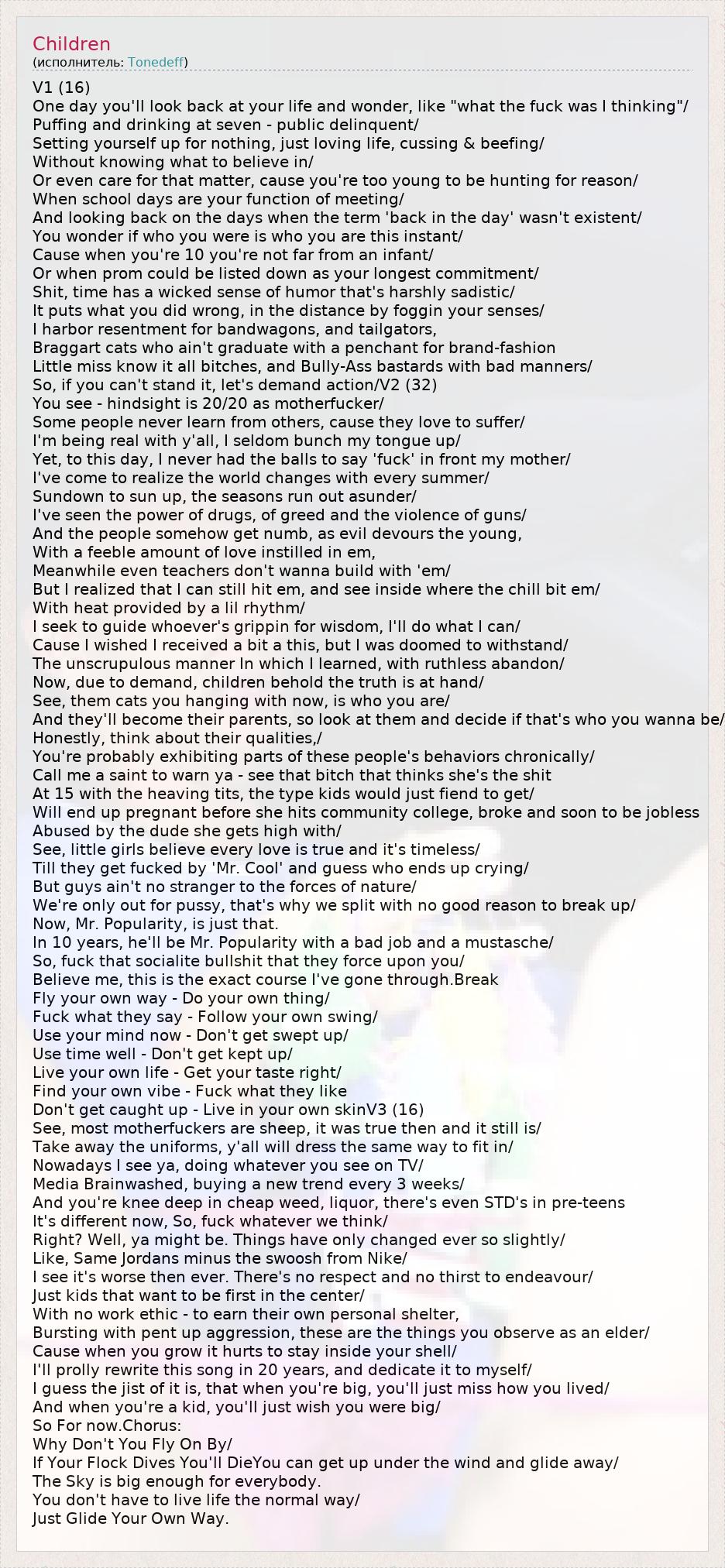 Это интересно:Tonedeff (born Anthony Rojas on December 14, 1978) is an American rapper, producer, and singer-songwriter from Queens, New York City.Known for his breathless vocal performances, rapid-fire delivery, which is alleged to be among the fastest in hip hop history at 13.5 syllables per second, he is said by critics as having "the best flows" of the current generation of emcees. Having developed a reputation as a self-sufficient artist who has been known to design his own album covers and edit his own videos, he is also known to sing and play piano on his tracks, as well as self-produce them.Tonedeff first gained national recognition on the underground hip hop scene after winning... продолжение
