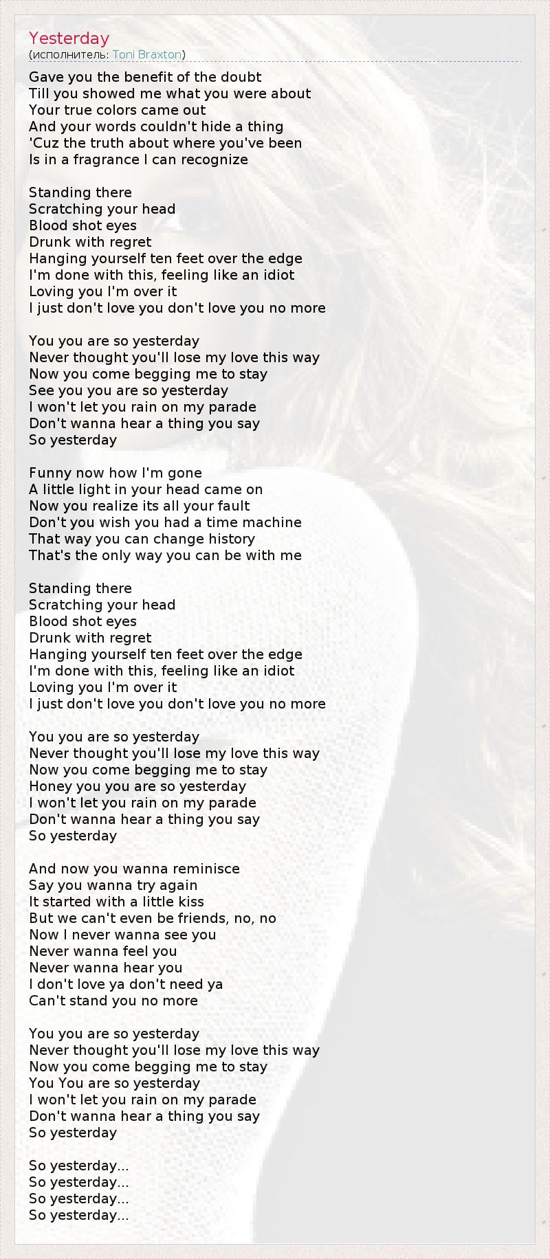 Я свято верила тебе, Пока ты не показал свое истинное лицо, Пока вся правда не вышла наружу. И твои слова уже не могли меня обмануть, Потому что правду о том, где ты был, Выдал чужой парфюм, исходящий от тебя. И теперь ты стоишь здесь, Рвешь на себе волосы, Твои глаза налиты кровью... Тебя переполняет сожаление, Подводя все ближе к пропасти. Мне надоело чувствовать себя идиоткой, Любовь больше не имеет надо мной власти. Я просто больше не люблю тебя, больше не люблю, пойми... Ты - вчерашний день. Ты никогда не думал, что так глупо потеряешь мою любовь, И теперь приходишь и умоляешь меня остаться... Видишь ли, милый, ты мой вчерашний день, И я не позволю тебе портить мне настроение. Не хочу слышать ни единого твоего слова. Ты - вчерашний день... Ну как, счастлив теперь, что я ушла? Наконец, хоть что-то прояснится в твоей голове. Теперь ты понимаешь, что это твоя вина И сожалеешь, что у тебя нет машины времени, Чтобы все изменить, Потому что это единственный способ быть со мной. И теперь ты стоишь здесь, Рвешь на себе волосы, Твои глаза налиты кровью... Тебя переполняет сожаление, Подводя все ближе к пропасти. Мне надоело чувствовать себя идиоткой, Продолжая любить тебя - с этим покончено. Я просто больше не люблю тебя, больше не люблю, пойми... Ты - вчерашний день. Ты никогда не думал, что так глупо потеряешь мою любовь, И теперь приходишь и умоляешь меня остаться... Видишь ли, ты мой вчерашний день, И я не позволю тебе портить мне настроение. Не хочу слышать ни единого твоего слова. Ты - вчерашний день... Теперь ты хочешь предаться воспоминаниям, Говоришь,что хочешь попробовать начать с начала, С маленького невинного поцелуя, Но мы теперь не можем остаться даже друзьями. Нет, нет. Но я больше не хочу тебя видеть, Никогда не хочу чувствовать твои прикосновения, Никогда не хочу слышать твой голос. Я не люблю тебя, ты мне не нужен, Я не выношу тебя теперь. Ты - вчерашний день. Ты никогда не думал, что так глупо потеряешь мою любовь, И теперь приходишь и умоляешь меня остаться... Видишь ли, ты мой вчерашний день, И я не позволю тебе портить мне настроение. Не хочу слышать ни единого твоего слова. Ты - вчерашний день... Вчерашний день... Вчерашний день... Вчерашний день... Вчерашний день...