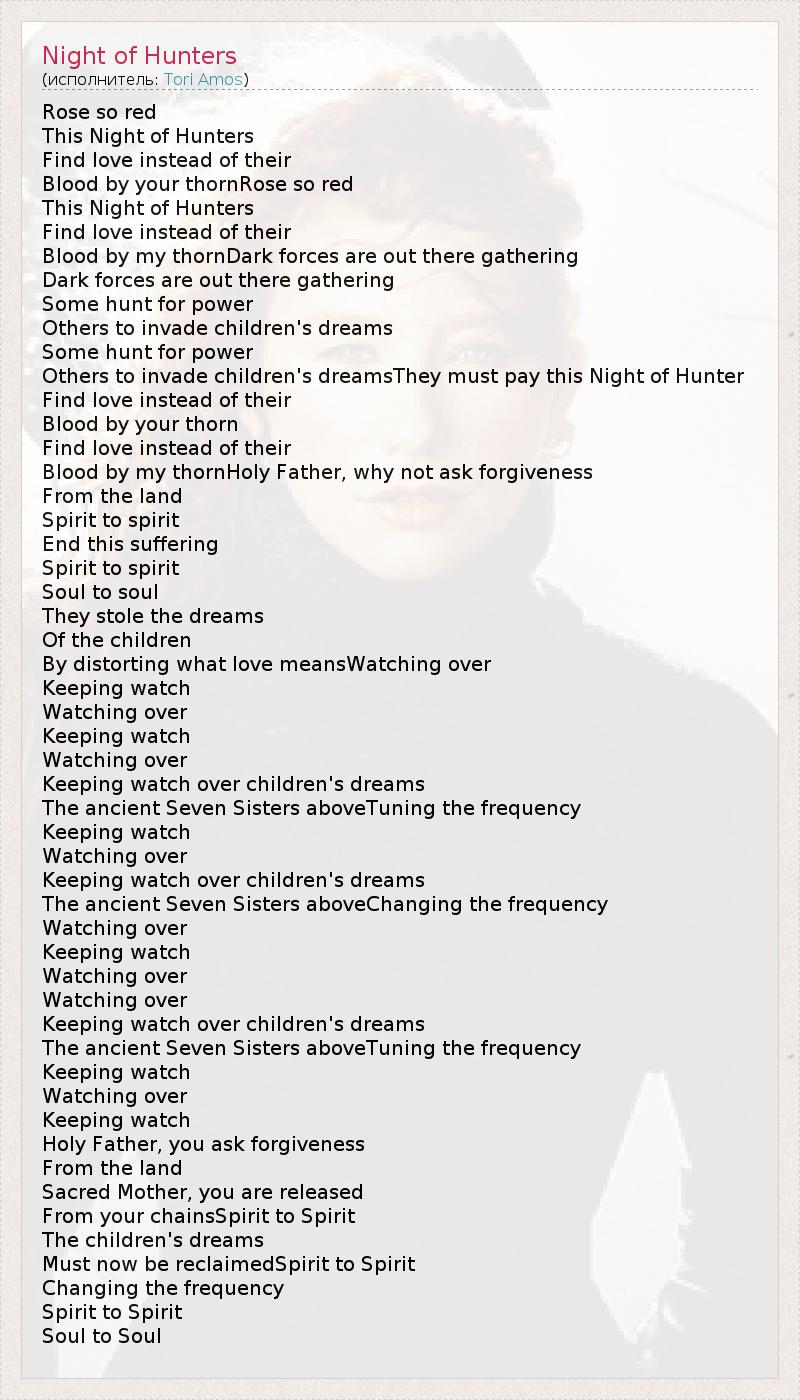 Независимая и непредсказуемая Тори Эймос на каждом новом альбоме старается предложить слушателю нечто новое, еще не встречавшееся в ее творчестве. Именно поэтому за двадцать с лишним лет активной работы в студии и на сцене певица неоднократно кардинально меняла свой стиль, но всегда в ее музыке было что-то, чего не было и быть не могло в творчестве других исполнителей. Очередное творение Эймос, широкомасштабное полотно под названием Night Of Hunters, как и следовало ожидать, располагает богатым набором интересных музыкальных решений и снова удивит даже самого подготовленного меломана. Сей диск разительно отличается от всех недавних работ Тори, поскольку записан с применением исключительно акустических инструментов. Неизменным осталось лишь широкое использование фортепиано, к которому также подключились струнные и духовые инструменты. Пластинка была выпущена немецким лейблом, специализирующимся на классической музыке, старым и, возможно, самым сильным увлечением Тори Эймос.