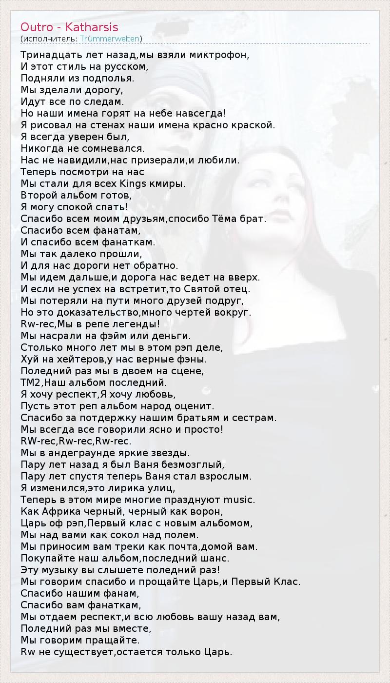 Тринадцать лет назад,мы взяли миктрофон, И этот стиль на русском, Подняли из подполья. Мы зделали дорогу, Идут все по следам. Но наши имена горят на небе навсегда! Я рисовал на стенах наши имена красно краской. Я всегда уверен был, Никогда не сомневался. Нас не навидили,нас призерали,и любили. Теперь посмотри на нас Мы стали для всех Kings кмиры. Второй альбом готов, Я могу спокой спать! Спасибо всем моим друзьям,спосибо Тёма брат. Спасибо всем фанатам, И спасибо всем фанаткам. Мы так далеко прошли, И для нас дороги нет обратно. Мы идем дальше,и дорога нас ведет на вверх. И если не успех на встретит,то Святой отец. Мы потеряли на пути много друзей подруг, Но это доказательство,много чертей вокруг. Rw-rec,Мы в репе легенды! Мы насрали на фэйм или деньги. Столько много лет мы в этом рэп деле, Хуй на хейтеров,у нас верные фэны. Поледний раз мы в двоем на сцене, ТМ2,Наш альбом последний. Я хочу респект,Я хочу любовь, Пусть этот реп альбом народ оценит. Спасибо за потдержку нашим братьям и сестрам. Мы всегда все говорили ясно и просто! RW-rec,Rw-rec,Rw-rec. Мы в андеграунде яркие звезды. Пару лет назад я был Ваня безмозглый, Пару лет спустя теперь Ваня стал взрослым. Я изменился,это лирика улиц, Теперь в этом мире многие празднуют music. Как Африка черный, черный как ворон, Царь оф рэп,Первый клас с новым альбомом, Мы над вами как сокол над полем. Мы приносим вам треки как почта,домой вам. Покупайте наш альбом,последний шанс. Эту музыку вы слышете поледний раз! Мы говорим спасибо и прощайте Царь,и Первый Клас. Спасибо нашим фанам, Спасибо вам фанаткам, Мы отдаем респект,и всю любовь вашу назад вам, Поледний раз мы вместе, Мы говорим пращайте. Rw не существует,остается только Царь.