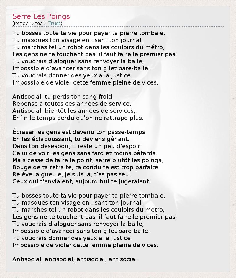 А как ты думаешь, о чем песня "Serre Les Poings" ?