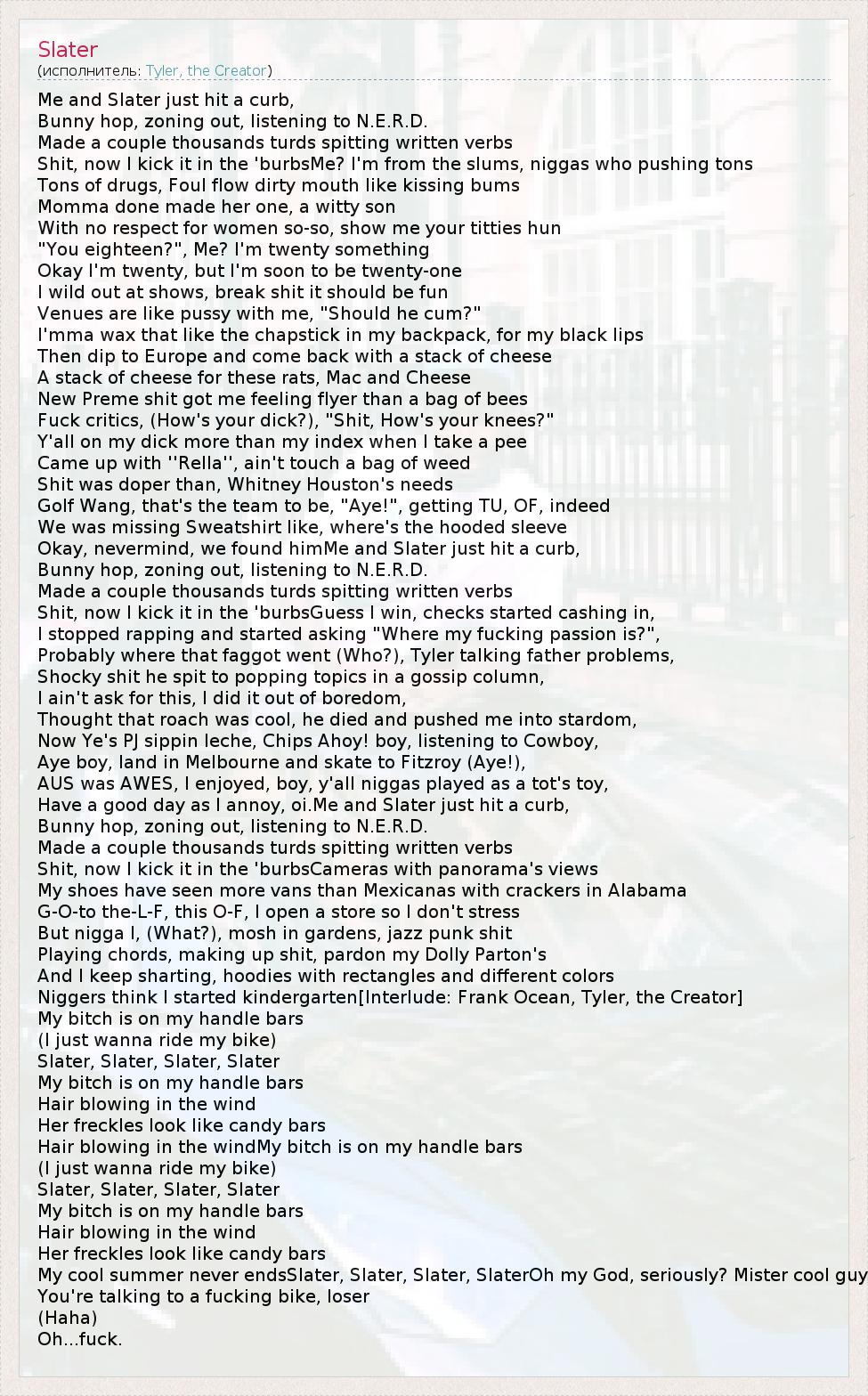 Niggers think I started kindergarten[Interlude: Frank Ocean, Tyler, the Creator]