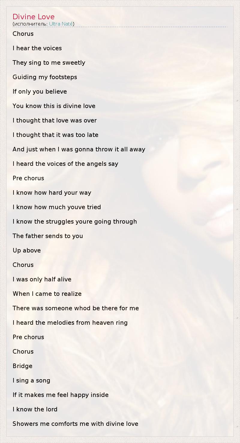 Chorus I hear the voices They sing to me sweetly Guiding my footsteps If only you believe You know this is divine love I thought that love was over I thought that it was too late And just when I was gonna throw it all away I heard the voices of the angels say Pre chorus I know how hard your way I know how much youve tried I know the struggles youre going through The father sends to you Up above Chorus I was only half alive When I came to realize There was someone whod be there for me I heard the melodies from heaven ring Pre chorus Chorus Bridge I sing a song If it makes me feel happy inside I know the lord Showers me comforts me with divine love