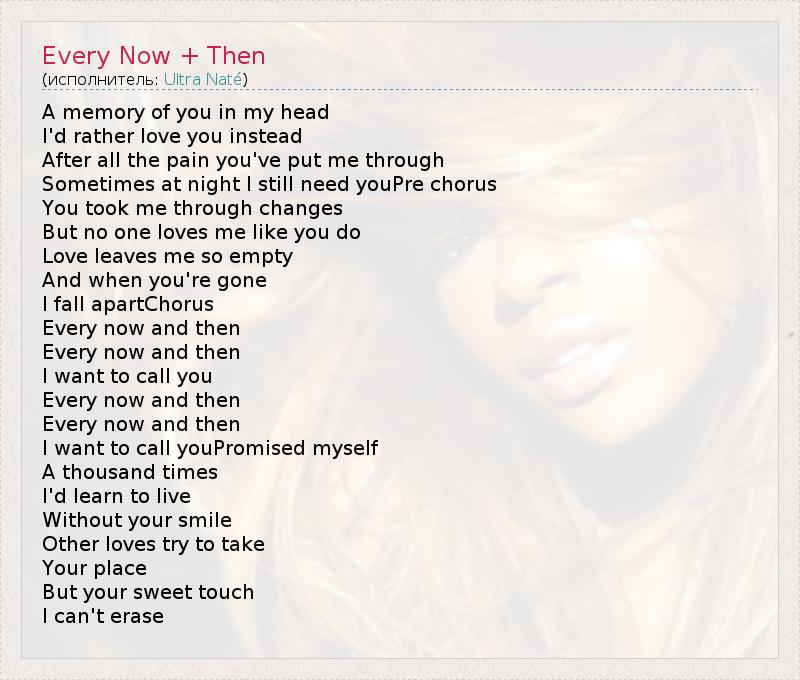 A memory of you in my head I'd rather love you instead After all the pain you've put me through Sometimes at night I still need youPre chorus You took me through changes But no one loves me like you do Love leaves me so empty And when you're gone I fall apartChorus Every now and then Every now and then I want to call you Every now and then Every now and then I want to call youPromised myself A thousand times I'd learn to live Without your smile Other loves try to take Your place But your sweet touch I can't erase