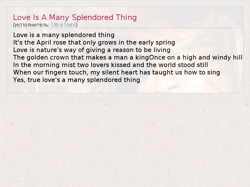 А как ты думаешь, о чем песня "Love Is A Many Splendored Thing" ?
