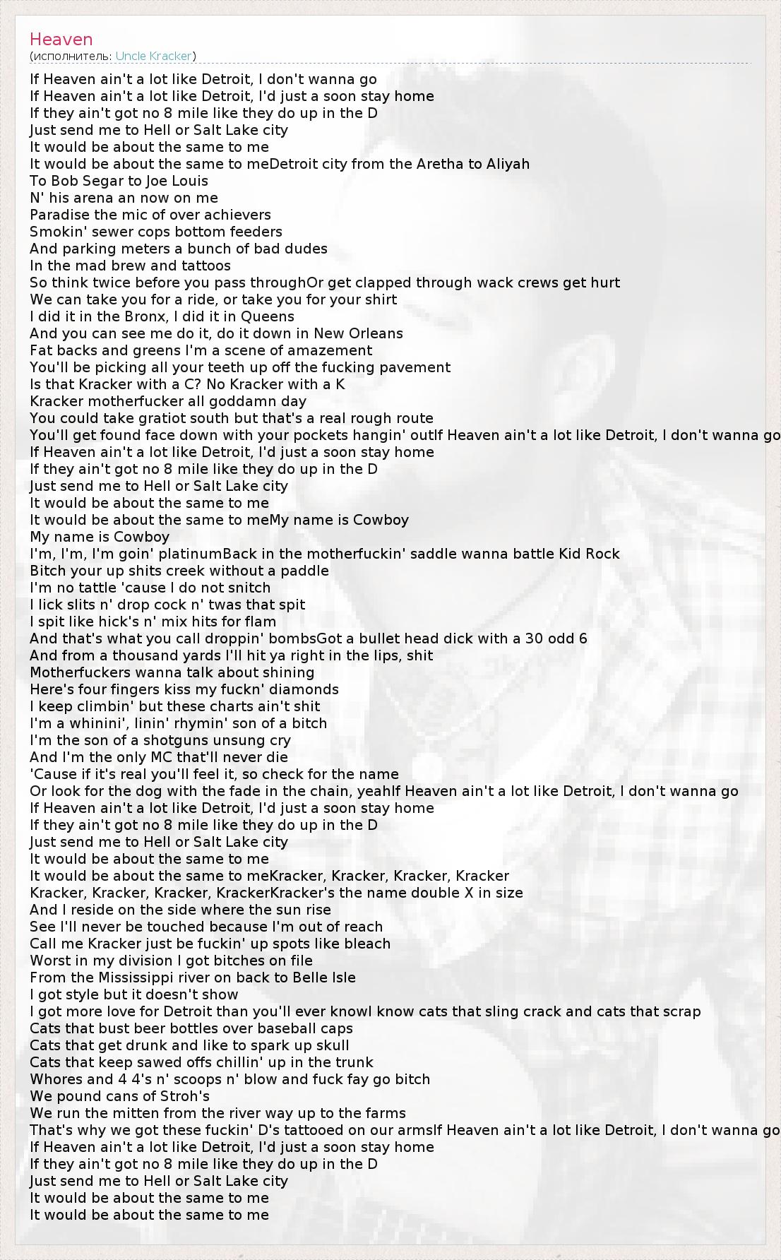 If Heaven ain't a lot like Detroit, I don't wanna go If Heaven ain't a lot like Detroit, I'd just a soon stay home If they ain't got no 8 mile like they do up in the D Just send me to Hell or Salt Lake city It would be about the same to me It would be about the same to meDetroit city from the Aretha to Aliyah To Bob Segar to Joe Louis N' his arena an now on me Paradise the mic of over achievers Smokin' sewer cops bottom feeders And parking meters a bunch of bad dudes In the mad brew and tattoos So think twice before you pass throughOr get clapped through wack crews get hurt We can take you for a ride, or take you for your shirt I did it in the Bronx, I did it in Queens And you can see me do it, do it down in New Orleans Fat backs and greens I'm a scene of amazement You'll be picking all your teeth up off the fucking pavement Is that Kracker with a C? No Kracker with a K Kracker motherfucker all goddamn day You could take gratiot south but that's a real rough route You'll get found face down with your pockets hangin' outIf Heaven ain't a lot like Detroit, I don't wanna go If Heaven ain't a lot like Detroit, I'd just a soon stay home If they ain't got no 8 mile like they do up in the D Just send me to Hell or Salt Lake city It would be about the same to me It would be about the same to meMy name is Cowboy My name is Cowboy I'm, I'm, I'm goin' platinumBack in the motherfuckin' saddle wanna battle Kid Rock Bitch your up shits creek without a paddle I'm no tattle 'cause I do not snitch I lick slits n' drop cock n' twas that spit I spit like hick's n' mix hits for flam And that's what you call droppin' bombsGot a bullet head dick with a 30 odd 6 And from a thousand yards I'll hit ya right in the lips, shit Motherfuckers wanna talk about shining Here's four fingers kiss my fuckn' diamonds I keep climbin' but these charts ain't shit I'm a whinini', linin' rhymin' son of a bitch I'm the son of a shotguns unsung cry And I'm the only MC that'll never die 'Cause if it's real you'll feel it, so check for the name Or look for the dog with the fade in the chain, yeahIf Heaven ain't a lot like Detroit, I don't wanna go If Heaven ain't a lot like Detroit, I'd just a soon stay home If they ain't got no 8 mile like they do up in the D Just send me to Hell or Salt Lake city It would be about the same to me It would be about the same to meKracker, Kracker, Kracker, Kracker Kracker, Kracker, Kracker, KrackerKracker's the name double X in size And I reside on the side where the sun rise See I'll never be touched because I'm out of reach Call me Kracker just be fuckin' up spots like bleach Worst in my division I got bitches on file From the Mississippi river on back to Belle Isle I got style but it doesn't show I got more love for Detroit than you'll ever knowI know cats that sling crack and cats that scrap Cats that bust beer bottles over baseball caps Cats that get drunk and like to spark up skull Cats that keep sawed offs chillin' up in the trunk Whores and 4 4's n' scoops n' blow and fuck fay go bitch We pound cans of Stroh's We run the mitten from the river way up to the farms That's why we got these fuckin' D's tattooed on our armsIf Heaven ain't a lot like Detroit, I don't wanna go If Heaven ain't a lot like Detroit, I'd just a soon stay home If they ain't got no 8 mile like they do up in the D Just send me to Hell or Salt Lake city It would be about the same to me It would be about the same to me