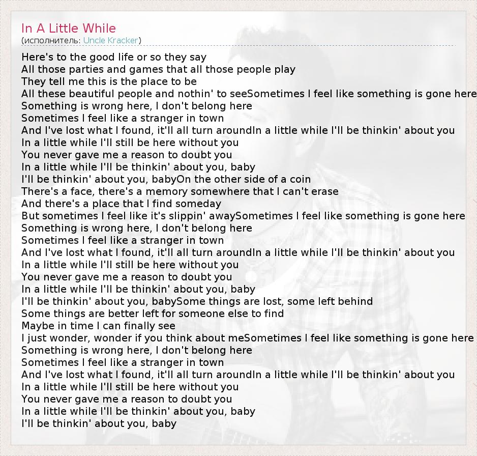 Это интересно:Uncle Kracker (настоящее имя Matthew Shafer) - американский рок-певец. Родился 9 ноября 1974 года в Мичигане. В 1987 году встретил Кид Рока, который попросил его стать ди-джеем. В середине 1990 годов Kracker занимался ди-джействованием в Детройте, в клубе The Pretty Woman. В 1999 году вышел дебютный альбом "Double Wide". Uncle Kracker участвовал в записи альбома Кид Рока "Cocky" в 2001 году. 16 ноября 2006 года началась работа над... продолжение