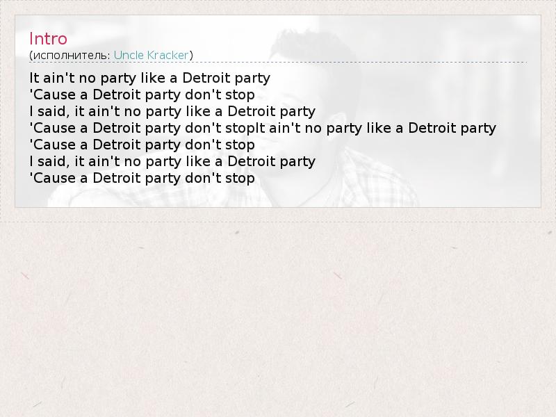 'Cause a Detroit party don't stopIt ain't no party like a Detroit party