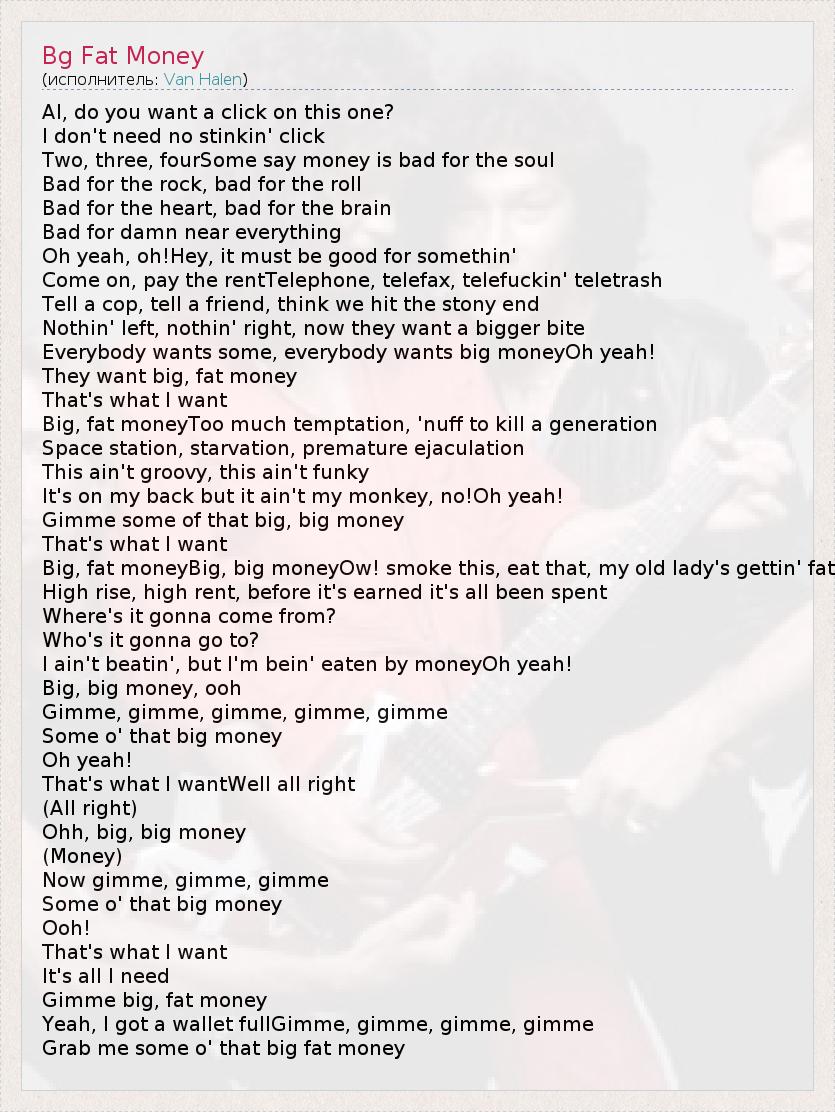 Big, fat moneyBig, big moneyOw! smoke this, eat that, my old lady's gettin' fat