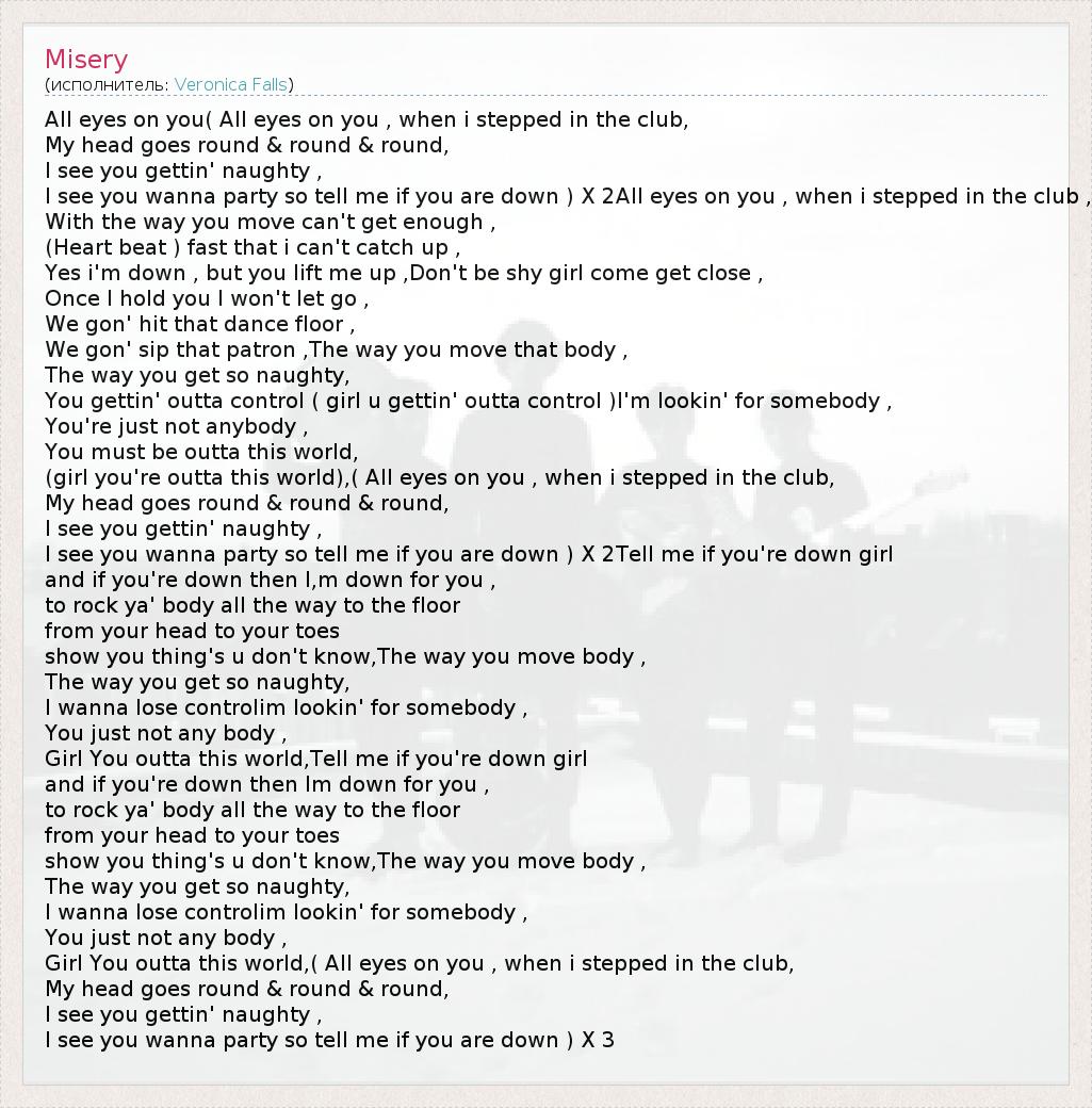 All eyes on you( All eyes on you , when i stepped in the club, My head goes round & round & round, I see you gettin' naughty , I see you wanna party so tell me if you are down ) X 2All eyes on you , when i stepped in the club , With the way you move can't get enough , (Heart beat ) fast that i can't catch up , Yes i'm down , but you lift me up ,Don't be shy girl come get close , Once I hold you I won't let go , We gon' hit that dance floor , We gon' sip that patron ,The way you move that body , The way you get so naughty, You gettin' outta control ( girl u gettin' outta control )I'm lookin' for somebody , You're just not anybody , You must be outta this world, (girl you're outta this world),( All eyes on you , when i stepped in the club, My head goes round & round & round, I see you gettin' naughty , I see you wanna party so tell me if you are down ) X 2Tell me if you're down girl and if you're down then I,m down for you , to rock ya' body all the way to the floor from your head to your toes show you thing's u don't know,The way you move body , The way you get so naughty, I wanna lose controlim lookin' for somebody , You just not any body , Girl You outta this world,Tell me if you're down girl and if you're down then Im down for you , to rock ya' body all the way to the floor from your head to your toes show you thing's u don't know,The way you move body , The way you get so naughty, I wanna lose controlim lookin' for somebody , You just not any body , Girl You outta this world,( All eyes on you , when i stepped in the club, My head goes round & round & round, I see you gettin' naughty , I see you wanna party so tell me if you are down ) X 3
