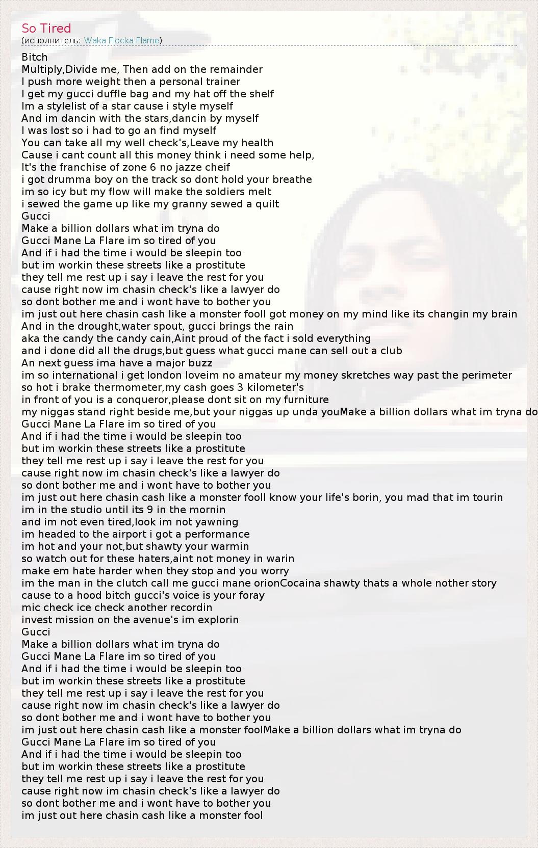Это интересно:Waka Flocka Flame - американский рэпер, настоящее имя Juaquin Malphurs, родился 31 мая 1986 года в Куинсе, Нью-Йорк.В возрасте девяти лет, Waka с родителями переехал в Ривердейл, штат Джорджия, а затем основался в Атланте, где он, собственно, и начал свою рэп карьеру.Его мать Debra Antney была менежером Gucci Mane и исполнительным директором So Icey/Mizay Entertainment. Несомненно, такое покровительство сыграло не маловажную роль... продолжение