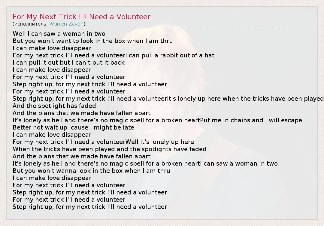 А как ты думаешь, о чем песня "For My Next Trick I'll Need a Volunteer" ?