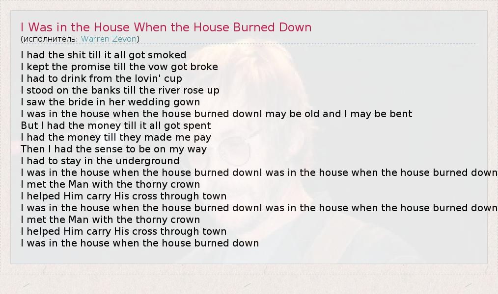ГлавнаяИсполнителиWarren ZevonI Was in the House When the House Burned Down