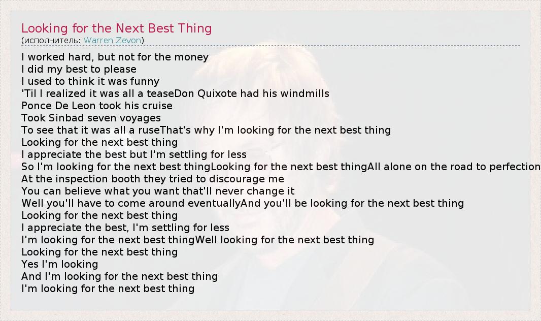 А как ты думаешь, о чем песня "Looking for the Next Best Thing" ?