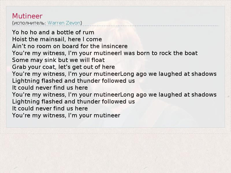 Yo ho ho and a bottle of rum Hoist the mainsail, here I come Ain't no room on board for the insincere You're my witness, I'm your mutineerI was born to rock the boat Some may sink but we will float Grab your coat, let's get out of here You're my witness, I'm your mutineerLong ago we laughed at shadows Lightning flashed and thunder followed us It could never find us here You're my witness, I'm your mutineerLong ago we laughed at shadows Lightning flashed and thunder followed us It could never find us here You're my witness, I'm your mutineer