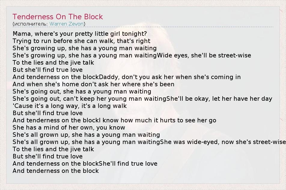 А как ты думаешь, о чем песня "Tenderness On The Block" ?