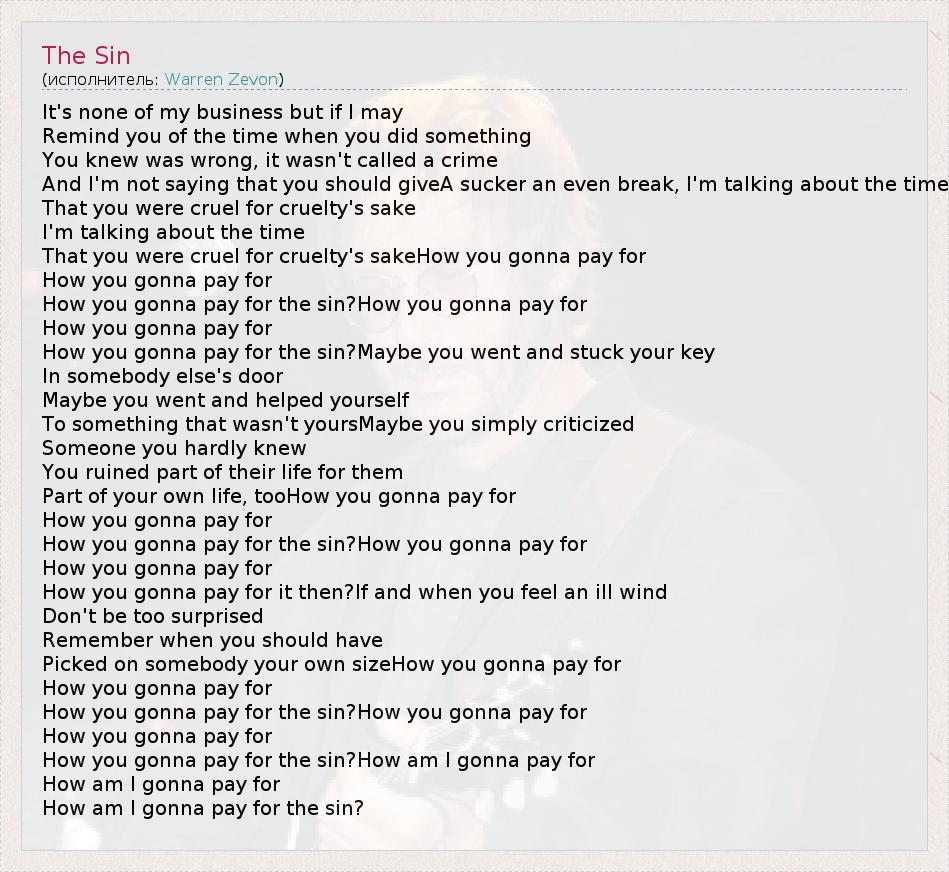 How you gonna pay for the sin?Maybe you went and stuck your key