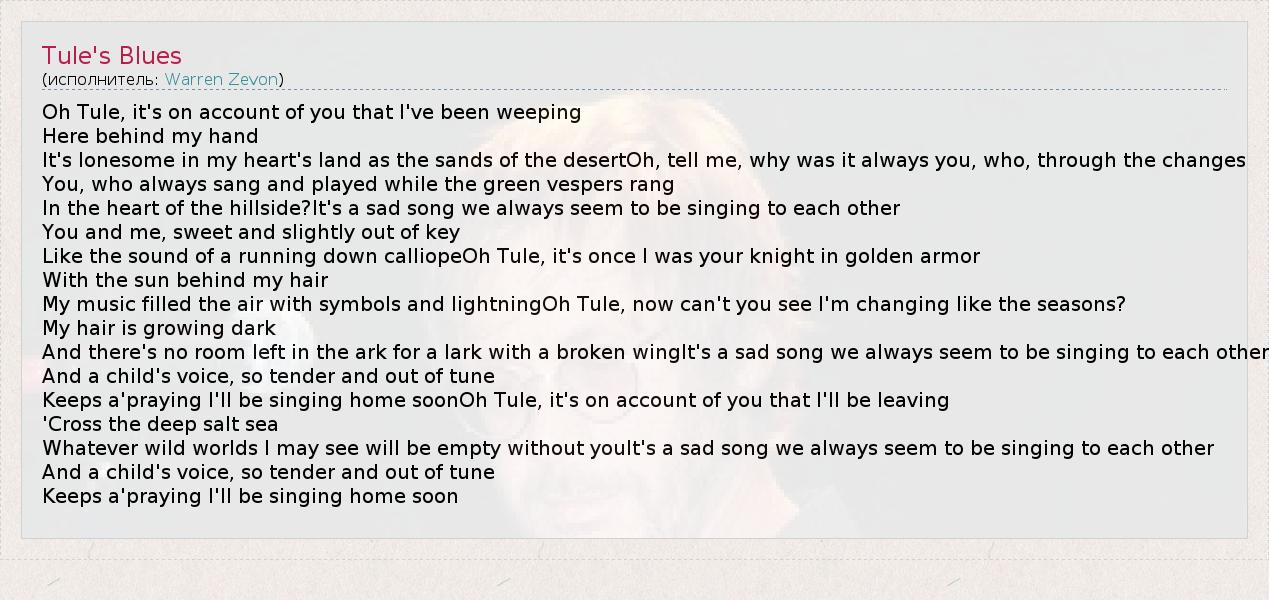 Это интересно:Уоррен Зивон - лаурет премии Грэмми, американский композитор, певец и музыкант. Список музыкантов, игравших в его альбомах, можно перепутать с алфавитным указателем справочника "Кто есть кто в современной рок-музыке": Боб Дилан, Дэвид Гилмор, Брюс Спрингстин, Том Петти сотоварищи, Грэм Нэш и Нил Янг, группа R.E.M. в полном составе… Вдохновение он черпал из совершенно разных источников... продолжение