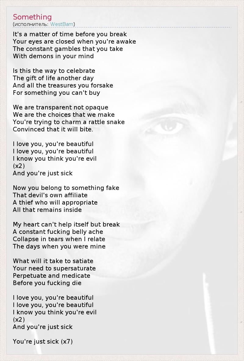 It's a matter of time before you break Your eyes are closed when you're awake The constant gambles that you take With demons in your mind Is this the way to celebrate The gift of life another day And all the treasures you forsake For something you can't buy We are transparent not opaque We are the choices that we make You're trying to charm a rattle snake Convinced that it will bite. I love you, you're beautiful I love you, you're beautiful I know you think you're evil (х2) And you're just sick Now you belong to something fake That devil's own affiliate A thief who will appropriate All that remains inside My heart can't help itself but break A constant fucking belly ache Collapse in tears when I relate The days when you were mine What will it take to satiate Your need to supersaturate Perpetuate and medicate Before you fucking die I love you, you're beautiful I love you, you're beautiful I know you think you're evil (х2) And you're just sick You're just sick (x7)