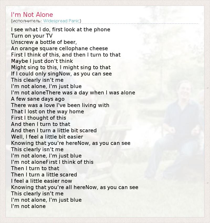 I see what I do, first look at the phone Turn on your TV Unscrew a bottle of beer, An orange square cellophane cheese First I think of this, and then I turn to that Maybe I just don't think Might sing to this, I might sing to that If I could only singNow, as you can see This clearly isn't me I'm not alone, I'm just blue I'm not aloneThere was a day when I was alone A few sane days ago There was a love I've been living with That I lost on the way home First I thought of this And then I turn to that And then I turn a little bit scared Well, I feel a little bit easier Knowing that you're hereNow, as you can see This clearly isn't me I'm not alone, I'm just blue I'm not aloneFirst I think of this Then I turn to that Then I turn a little scared I feel a little easier now Knowing that you're all hereNow, as you can see This clearly isn't me I'm not alone, I'm just blue I'm not alone