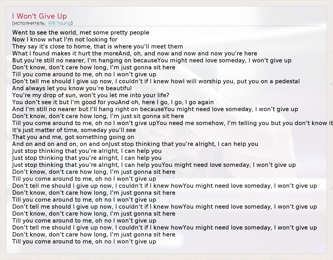 Don't tell me should I give up now, I couldn't if I knew howYou might need love someday, I won't give up