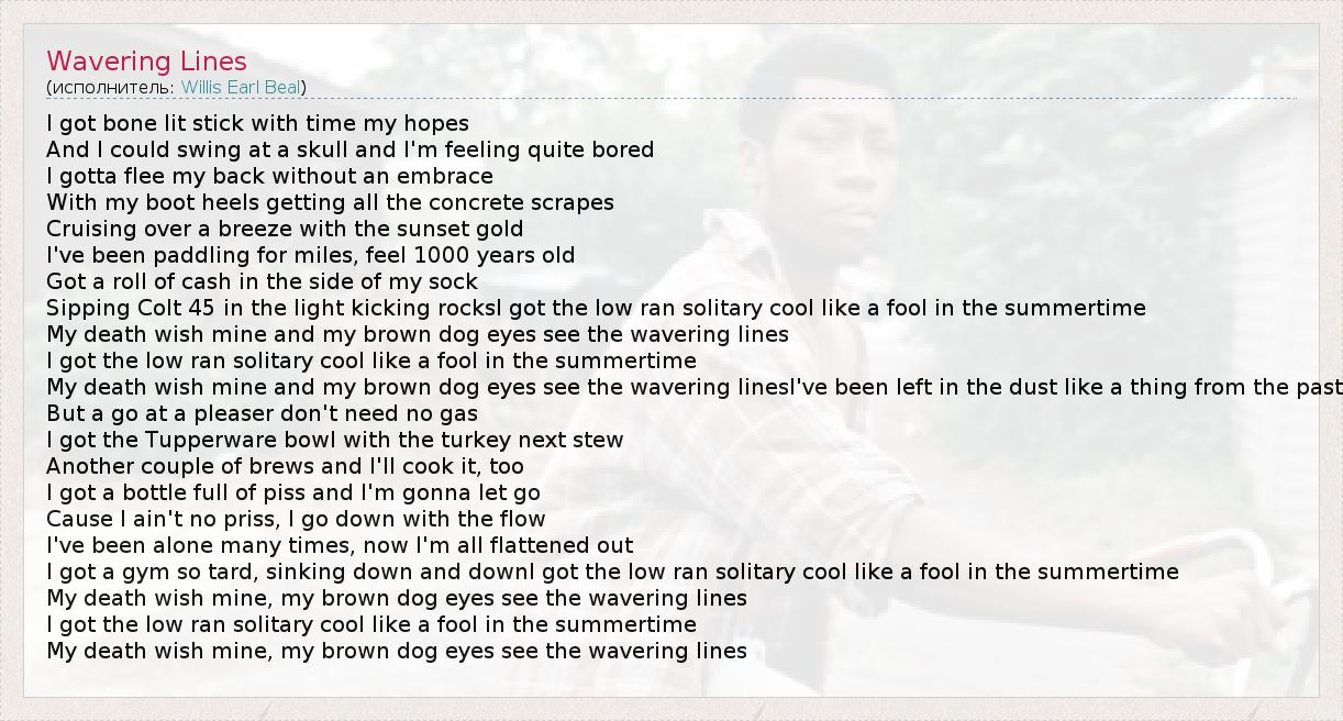I got bone lit stick with time my hopes And I could swing at a skull and I'm feeling quite bored I gotta flee my back without an embrace With my boot heels getting all the concrete scrapes Cruising over a breeze with the sunset gold I've been paddling for miles, feel 1000 years old Got a roll of cash in the side of my sock Sipping Colt 45 in the light kicking rocksI got the low ran solitary cool like a fool in the summertime My death wish mine and my brown dog eyes see the wavering lines I got the low ran solitary cool like a fool in the summertime My death wish mine and my brown dog eyes see the wavering linesI've been left in the dust like a thing from the past But a go at a pleaser don't need no gas I got the Tupperware bowl with the turkey next stew Another couple of brews and I'll cook it, too I got a bottle full of piss and I'm gonna let go Cause I ain't no priss, I go down with the flow I've been alone many times, now I'm all flattened out I got a gym so tard, sinking down and downI got the low ran solitary cool like a fool in the summertime My death wish mine, my brown dog eyes see the wavering lines I got the low ran solitary cool like a fool in the summertime My death wish mine, my brown dog eyes see the wavering lines