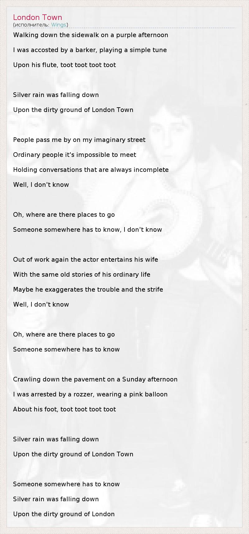 Walking down the sidewalk on a purple afternoon I was accosted by a barker, playing a simple tune Upon his flute, toot toot toot toot Silver rain was falling down Upon the dirty ground of London Town People pass me by on my imaginary street Ordinary people it's impossible to meet Holding conversations that are always incomplete Well, I don't know Oh, where are there places to go Someone somewhere has to know, I don't know Out of work again the actor entertains his wife With the same old stories of his ordinary life Maybe he exaggerates the trouble and the strife Well, I don't know Oh, where are there places to go Someone somewhere has to know Crawling down the pavement on a Sunday afternoon I was arrested by a rozzer, wearing a pink balloon About his foot, toot toot toot toot Silver rain was falling down Upon the dirty ground of London Town Someone somewhere has to know Silver rain was falling down Upon the dirty ground of London