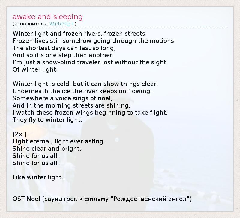 Winter light and frozen rivers, frozen streets. Frozen lives still somehow going through the motions. The shortest days can last so long, And so it's one step then another. I'm just a snow-blind traveler lost without the sight Of winter light. Winter light is cold, but it can show things clear. Underneath the ice the river keeps on flowing. Somewhere a voice sings of noel, And in the morning streets are shining. I watch these frozen wings beginning to take flight. They fly to winter light. [2x:] Light eternal, light everlasting. Shine clear and bright. Shine for us all. Shine for us all. Like winter light. OST Noel (саундтрек к фильму "Рождественский ангел")