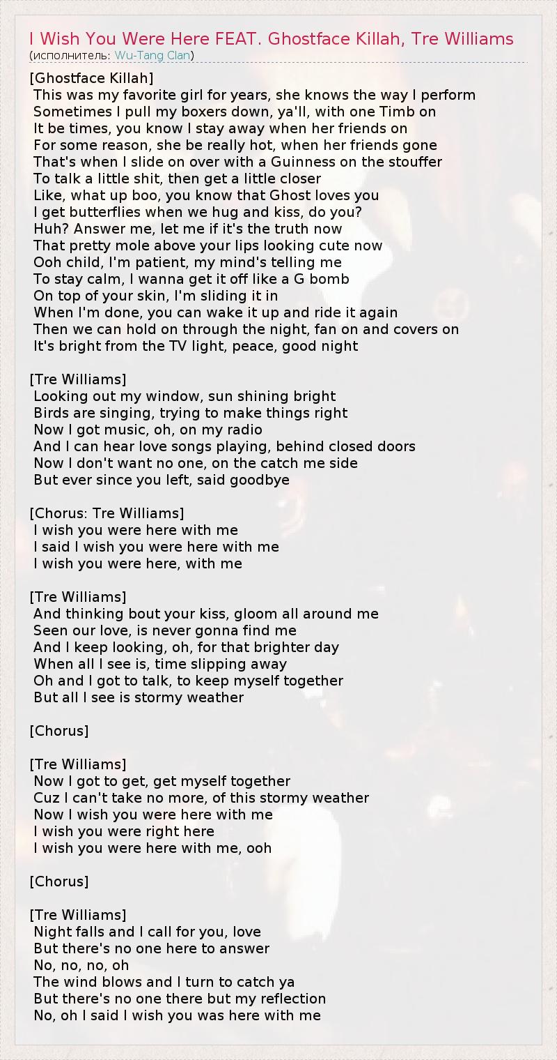 [Ghostface Killah] This was my favorite girl for years, she knows the way I perform Sometimes I pull my boxers down, ya'll, with one Timb on It be times, you know I stay away when her friends on For some reason, she be really hot, when her friends gone That's when I slide on over with a Guinness on the stouffer To talk a little shit, then get a little closer Like, what up boo, you know that Ghost loves you I get butterflies when we hug and kiss, do you? Huh? Answer me, let me if it's the truth now That pretty mole above your lips looking cute now Ooh child, I'm patient, my mind's telling me To stay calm, I wanna get it off like a G bomb On top of your skin, I'm sliding it in When I'm done, you can wake it up and ride it again Then we can hold on through the night, fan on and covers on It's bright from the TV light, peace, good night [Tre Williams] Looking out my window, sun shining bright Birds are singing, trying to make things right Now I got music, oh, on my radio And I can hear love songs playing, behind closed doors Now I don't want no one, on the catch me side But ever since you left, said goodbye [Chorus: Tre Williams] I wish you were here with me I said I wish you were here with me I wish you were here, with me [Tre Williams] And thinking bout your kiss, gloom all around me Seen our love, is never gonna find me And I keep looking, oh, for that brighter day When all I see is, time slipping away Oh and I got to talk, to keep myself together But all I see is stormy weather [Chorus] [Tre Williams] Now I got to get, get myself together Cuz I can't take no more, of this stormy weather Now I wish you were here with me I wish you were right here I wish you were here with me, ooh [Chorus] [Tre Williams] Night falls and I call for you, love But there's no one here to answer No, no, no, oh The wind blows and I turn to catch ya But there's no one there but my reflection No, oh I said I wish you was here with me