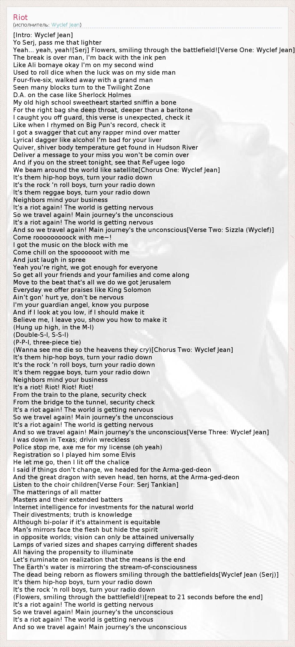 [Intro: Wyclef Jean] Yo Serj, pass me that lighter Yeah... yeah, yeah![Serj] Flowers, smiling through the battlefield![Verse One: Wyclef Jean] The break is over man, I'm back with the ink pen Like Ali bomaye okay I'm on my second wind Used to roll dice when the luck was on my side man Four-five-six, walked away with a grand man Seen many blocks turn to the Twilight Zone D.A. on the case like Sherlock Holmes My old high school sweetheart started sniffin a bone For the right bag she deep throat, deeper than a baritone I caught you off guard, this verse is unexpected, check it Like when I rhymed on Big Pun's record, check it I got a swagger that cut any rapper mind over matter Lyrical dagger like alcohol I'm bad for your liver Quiver, shiver body temperature get found in Hudson River Deliver a message to your miss you won't be comin over And if you on the street tonight, see that ReFugee logo We beam around the world like satellite[Chorus One: Wyclef Jean] It's them hip-hop boys, turn your radio down It's the rock 'n roll boys, turn your radio down It's them reggae boys, turn your radio down Neighbors mind your business It's a riot again! The world is getting nervous So we travel again! Main journey's the unconscious It's a riot again! The world is getting nervous And so we travel again! Main journey's the unconscious[Verse Two: Sizzla (Wyclef)] Come rooooooooock with me~! I got the music on the block with me Come chill on the spoooooot with me And just laugh in spree Yeah you're right, we got enough for everyone So get all your friends and your families and come along Move to the beat that's all we do we got Jerusalem Everyday we offer praises like King Solomon Ain't gon' hurt ye, don't be nervous I'm your guardian angel, know you purpose And if I look at you low, if I should make it Believe me, I leave you, show you how to make it (Hung up high, in the M-I) (Double-S-I, S-S-I) (P-P-I, three-piece tie) (Wanna see me die so the heavens they cry)[Chorus Two: Wyclef Jean] It's them hip-hop boys, turn your radio down It's the rock 'n roll boys, turn your radio down It's them reggae boys, turn your radio down Neighbors mind your business It's a riot! Riot! Riot! Riot! From the train to the plane, security check From the bridge to the tunnel, security check It's a riot again! The world is getting nervous So we travel again! Main journey's the unconscious It's a riot again! The world is getting nervous And so we travel again! Main journey's the unconscious[Verse Three: Wyclef Jean] I was down in Texas; drivin wreckless Police stop me, axe me for my license (oh yeah) Registration so I played him some Elvis He let me go, then I lit off the chalice I said if things don't change, we headed for the Arma-ged-deon And the great dragon with seven head, ten horns, at the Arma-ged-deon Listen to the choir children[Verse Four: Serj Tankian] The matterings of all matter Masters and their extended batters Internet intelligence for investments for the natural world Their divestments; truth is knowledge Although bi-polar if it's attainment is equitable Man's mirrors face the flesh but hide the spirit in opposite worlds; vision can only be attained universally Lamps of varied sizes and shapes carrying different shades All having the propensity to illuminate Let's ruminate on realization that the means is the end The Earth's water is mirroring the stream-of-consciousness The dead being reborn as flowers smiling through the battlefields[Wyclef Jean (Serj)] It's them hip-hop boys, turn your radio down It's the rock 'n roll boys, turn your radio down (Flowers, smiling through the battlefield!)[repeat to 21 seconds before the end] It's a riot again! The world is getting nervous So we travel again! Main journey's the unconscious It's a riot again! The world is getting nervous And so we travel again! Main journey's the unconscious