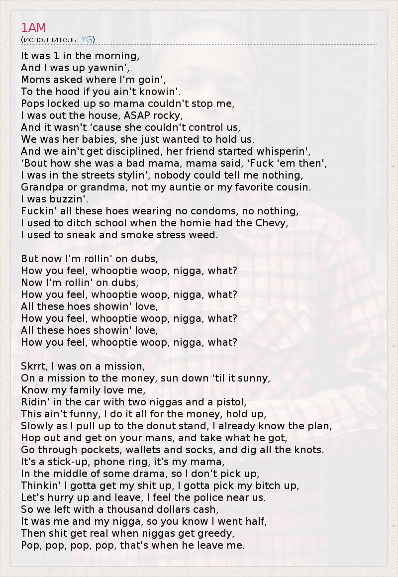 Это интересно:Существует несколько исполнителей по имени "YG":1) С тех пор как Warren G одарил Def Jam/Rush Associated Labels своим супер хитом “Regulate…G Funk Era” в 1994 году и на лейбл посыпались замечания о его несостоятельности, на Def Jam в основном стали процветать такие рэперы южного и восточного побережья как -Z, Ghostface Killah, Method Man, а так же Young Jeezy. Но приближаясь к своему 25-летнему юбилею, лейбл всё таки вновь обратился... продолжение
