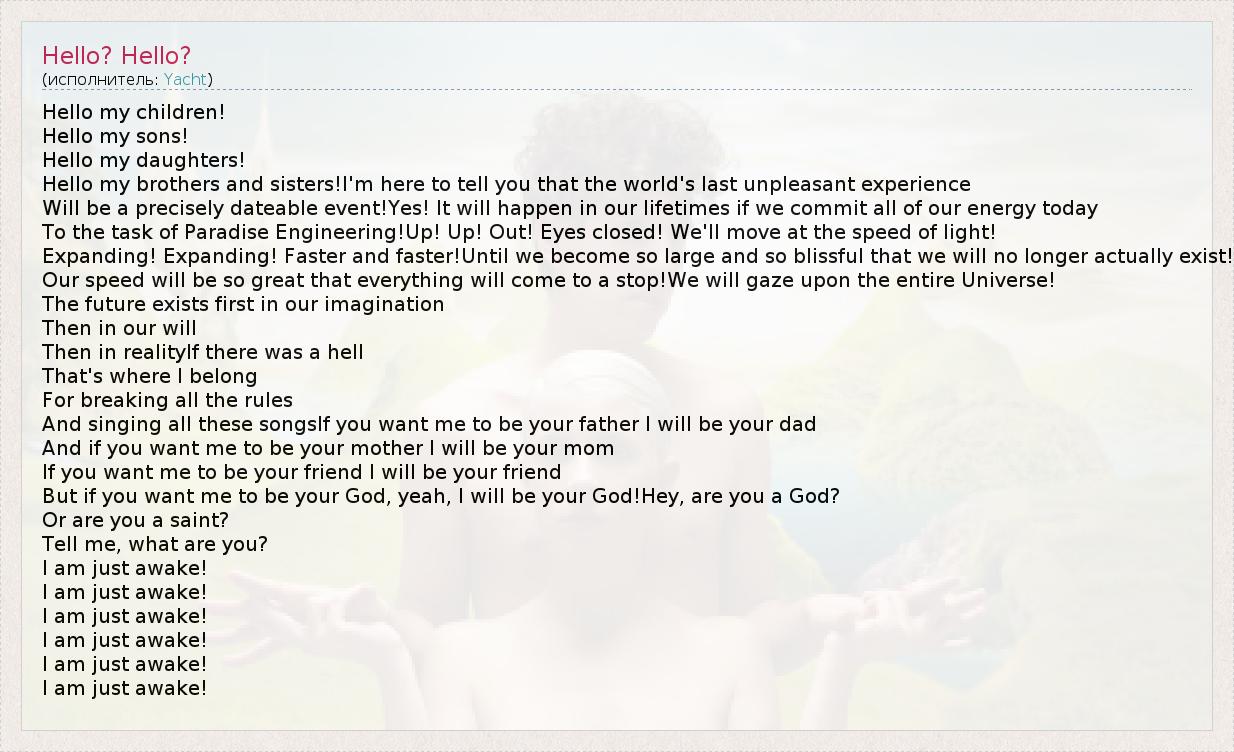 Hello my children! Hello my sons! Hello my daughters! Hello my brothers and sisters!I'm here to tell you that the world's last unpleasant experience Will be a precisely dateable event!Yes! It will happen in our lifetimes if we commit all of our energy today To the task of Paradise Engineering!Up! Up! Out! Eyes closed! We'll move at the speed of light! Expanding! Expanding! Faster and faster!Until we become so large and so blissful that we will no longer actually exist! Our speed will be so great that everything will come to a stop!We will gaze upon the entire Universe! The future exists first in our imagination Then in our will Then in realityIf there was a hell That's where I belong For breaking all the rules And singing all these songsIf you want me to be your father I will be your dad And if you want me to be your mother I will be your mom If you want me to be your friend I will be your friend But if you want me to be your God, yeah, I will be your God!Hey, are you a God? Or are you a saint? Tell me, what are you? I am just awake! I am just awake! I am just awake! I am just awake! I am just awake! I am just awake!