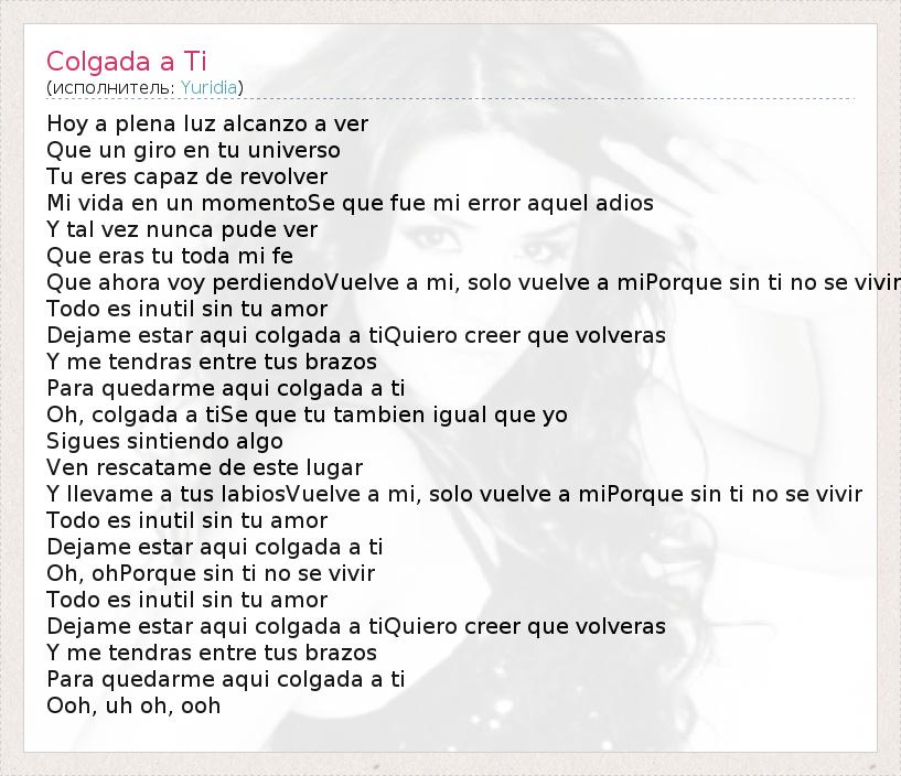 Hoy a plena luz alcanzo a ver Que un giro en tu universo Tu eres capaz de revolver Mi vida en un momentoSe que fue mi error aquel adios Y tal vez nunca pude ver Que eras tu toda mi fe Que ahora voy perdiendoVuelve a mi, solo vuelve a miPorque sin ti no se vivir Todo es inutil sin tu amor Dejame estar aqui colgada a tiQuiero creer que volveras Y me tendras entre tus brazos Para quedarme aqui colgada a ti Oh, colgada a tiSe que tu tambien igual que yo Sigues sintiendo algo Ven rescatame de este lugar Y llevame a tus labiosVuelve a mi, solo vuelve a miPorque sin ti no se vivir Todo es inutil sin tu amor Dejame estar aqui colgada a ti Oh, ohPorque sin ti no se vivir Todo es inutil sin tu amor Dejame estar aqui colgada a tiQuiero creer que volveras Y me tendras entre tus brazos Para quedarme aqui colgada a ti Ooh, uh oh, ooh
