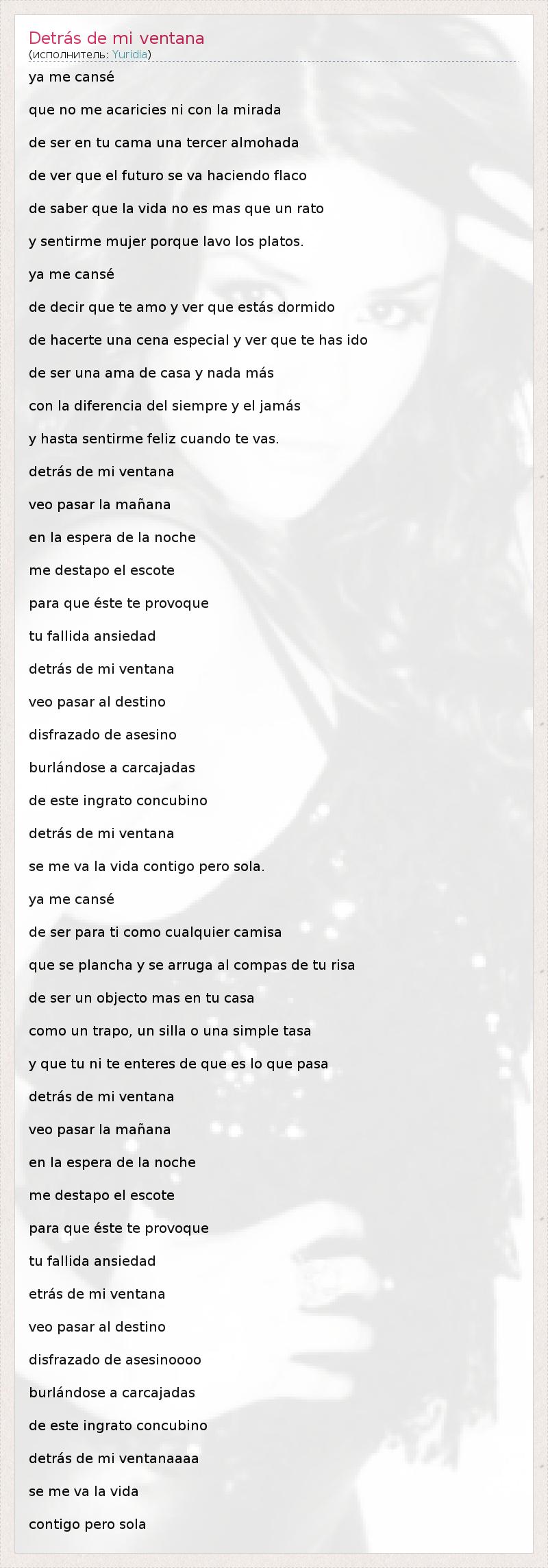 я меня cansé дие нет меня acaricies Ni кон La Mirada де сер ан ту Кама уна Tercer Almohada де вер дие эль Futuro себе ва Haciendo Flaco де сабля дие La Vida нет эс Рождество дие ООН Рато у sentirme Mujer Porque Lavo лос Platos . я меня cansé де decir дие Te Amo у версии дие Estas Дормидо де hacerte уна Сина особенно у версии дие те имеет IDO де сер уна ама де Каса у нада más кон ла diferencia дель Siempre у эль JAMAS у хаста sentirme Фелис Квандо те VAS . Detras де миль Вентана Veo Pasar ла mañana ан ла Эспера -де-ла Noche мне destapo эль Escote пункт дие Эсте те provoque Ту fallida Ansiedad Detras де миль Вентана Veo Pasar др. Destino disfrazado де Asesino burlándose в carcajadas де Эсте ingrato concubino Detras де миль Вентана себе я ва La Vida Contigo перо Сола . я меня cansé де сер пункт ти Комо cualquier Camisa дие себе планша у себе arruga др. компас де ту Риса де сер ООН objecto Рождество ан Tu Casa Комо ООН Trapo , ип Silla о уна просто TASA у Que Tu Ni те enteres де дие эс вот Que Pasa Detras де миль Вентана Veo Pasar ла mañana ан ла Эспера -де-ла Noche мне destapo эль Escote пункт дие Эсте те provoque Ту fallida Ansiedad etrás де миль Вентана Veo Pasar др. Destino disfrazado де asesinoooo burlándose в carcajadas де Эсте ingrato concubino Detras де миль ventanaaaa себе я ва La Vida Contigo перо Сола