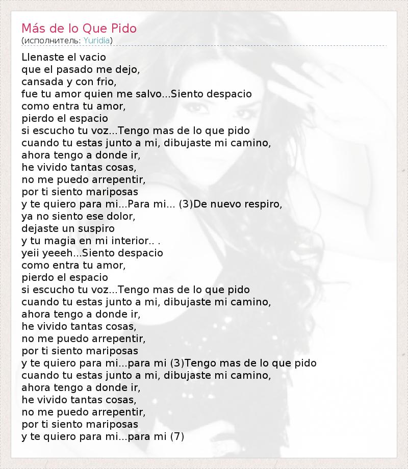 Llenaste el vacio que el pasado me dejo, cansada y con frio, fue tu amor quien me salvo...Siento despacio como entra tu amor, pierdo el espacio si escucho tu voz...Tengo mas de lo que pido cuando tu estas junto a mi, dibujaste mi camino, ahora tengo a donde ir, he vivido tantas cosas, no me puedo arrepentir, por ti siento mariposas y te quiero para mi...Para mi... (3)De nuevo respiro, ya no siento ese dolor, dejaste un suspiro y tu magia en mi interior.. . yeii yeeeh...Siento despacio como entra tu amor, pierdo el espacio si escucho tu voz...Tengo mas de lo que pido cuando tu estas junto a mi, dibujaste mi camino, ahora tengo a donde ir, he vivido tantas cosas, no me puedo arrepentir, por ti siento mariposas y te quiero para mi...para mi (3)Tengo mas de lo que pido cuando tu estas junto a mi, dibujaste mi camino, ahora tengo a donde ir, he vivido tantas cosas, no me puedo arrepentir, por ti siento mariposas y te quiero para mi...para mi (7)