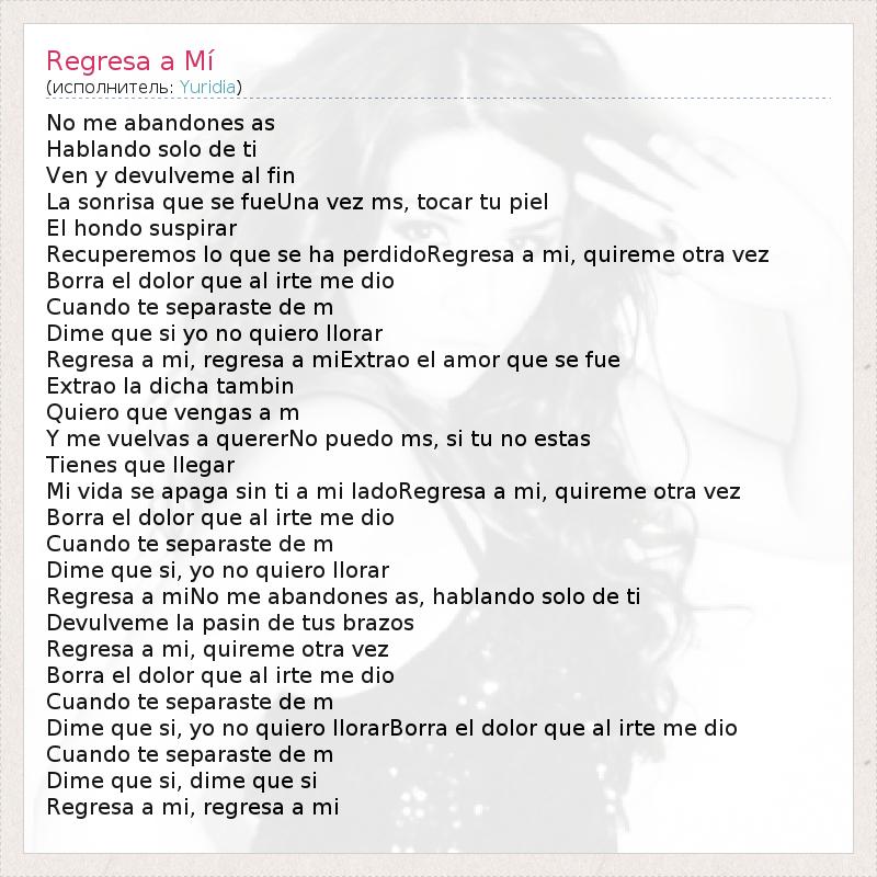 No me abandones as Hablando solo de ti Ven y devulveme al fin La sonrisa que se fueUna vez ms, tocar tu piel El hondo suspirar Recuperemos lo que se ha perdidoRegresa a mi, quireme otra vez Borra el dolor que al irte me dio Cuando te separaste de m Dime que si yo no quiero llorar Regresa a mi, regresa a miExtrao el amor que se fue Extrao la dicha tambin Quiero que vengas a m Y me vuelvas a quererNo puedo ms, si tu no estas Tienes que llegar Mi vida se apaga sin ti a mi ladoRegresa a mi, quireme otra vez Borra el dolor que al irte me dio Cuando te separaste de m Dime que si, yo no quiero llorar Regresa a miNo me abandones as, hablando solo de ti Devulveme la pasin de tus brazos Regresa a mi, quireme otra vez Borra el dolor que al irte me dio Cuando te separaste de m Dime que si, yo no quiero llorarBorra el dolor que al irte me dio Cuando te separaste de m Dime que si, dime que si Regresa a mi, regresa a mi
