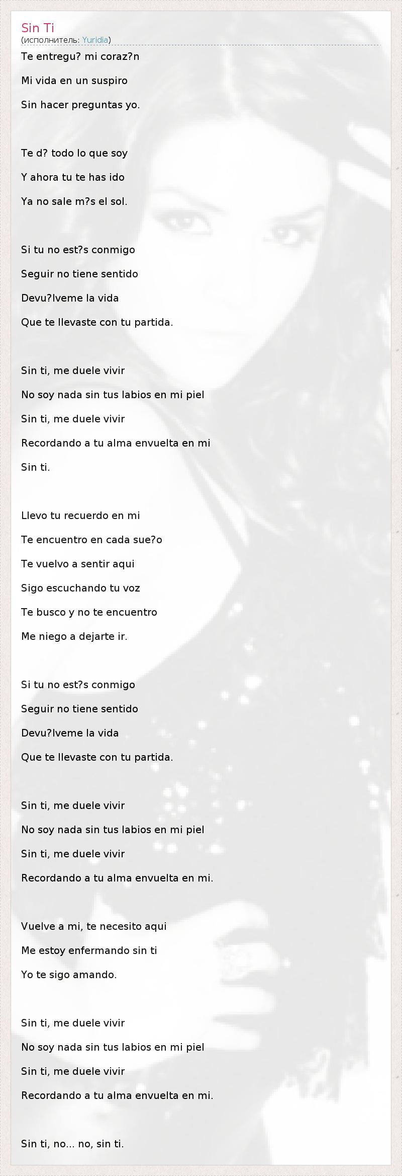 Te entregu? mi coraz?n Mi vida en un suspiro Sin hacer preguntas yo. Te d? todo lo que soy Y ahora tu te has ido Ya no sale m?s el sol. Si tu no est?s conmigo Seguir no tiene sentido Devu?lveme la vida Que te llevaste con tu partida. Sin ti, me duele vivir No soy nada sin tus labios en mi piel Sin ti, me duele vivir Recordando a tu alma envuelta en mi Sin ti. Llevo tu recuerdo en mi Te encuentro en cada sue?o Te vuelvo a sentir aqui Sigo escuchando tu voz Te busco y no te encuentro Me niego a dejarte ir. Si tu no est?s conmigo Seguir no tiene sentido Devu?lveme la vida Que te llevaste con tu partida. Sin ti, me duele vivir No soy nada sin tus labios en mi piel Sin ti, me duele vivir Recordando a tu alma envuelta en mi. Vuelve a mi, te necesito aqui Me estoy enfermando sin ti Yo te sigo amando. Sin ti, me duele vivir No soy nada sin tus labios en mi piel Sin ti, me duele vivir Recordando a tu alma envuelta en mi. Sin ti, no... no, sin ti.
