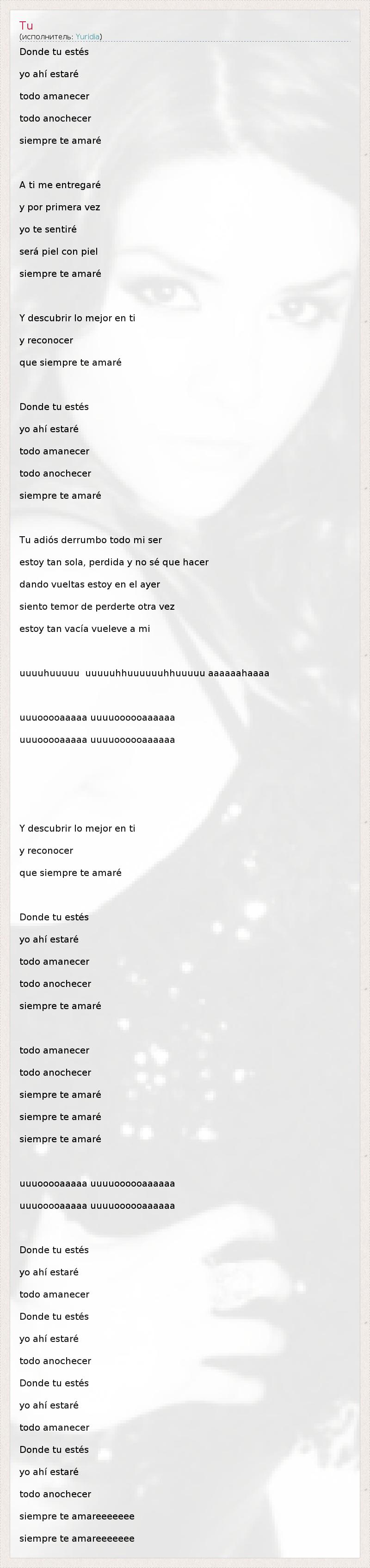 Donde tu estés yo ahí estaré todo amanecer todo anochecer siempre te amaré A ti me entregaré y por primera vez yo te sentiré será piel con piel siempre te amaré Y descubrir lo mejor en ti y reconocer que siempre te amaré Donde tu estés yo ahí estaré todo amanecer todo anochecer siempre te amaré Tu adiós derrumbo todo mi ser estoy tan sola, perdida y no sé que hacer dando vueltas estoy en el ayer siento temor de perderte otra vez estoy tan vacía vueleve a mi uuuuhuuuuu uuuuuhhuuuuuuhhuuuuu aaaaaahaaaa uuuooooaaaaa uuuuoooooaaaaaa uuuooooaaaaa uuuuoooooaaaaaa Y descubrir lo mejor en ti y reconocer que siempre te amaré Donde tu estés yo ahí estaré todo amanecer todo anochecer siempre te amaré todo amanecer todo anochecer siempre te amaré siempre te amaré siempre te amaré uuuooooaaaaa uuuuoooooaaaaaa uuuooooaaaaa uuuuoooooaaaaaa Donde tu estés yo ahí estaré todo amanecer Donde tu estés yo ahí estaré todo anochecer Donde tu estés yo ahí estaré todo amanecer Donde tu estés yo ahí estaré todo anochecer siempre te amareeeeeee siempre te amareeeeeee