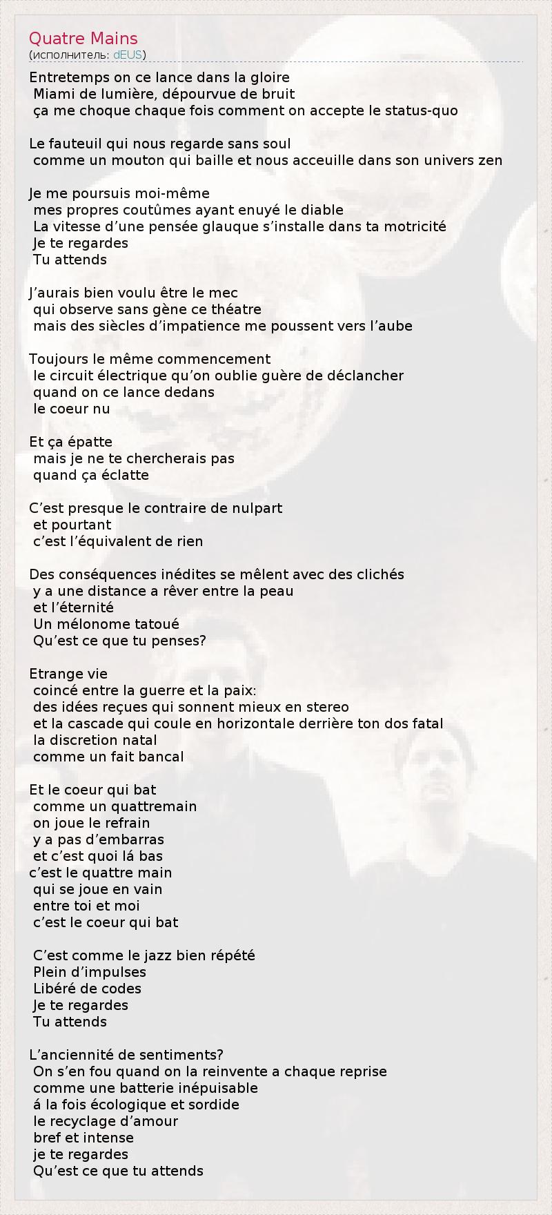А как ты думаешь, о чем песня "Quatre Mains" ?