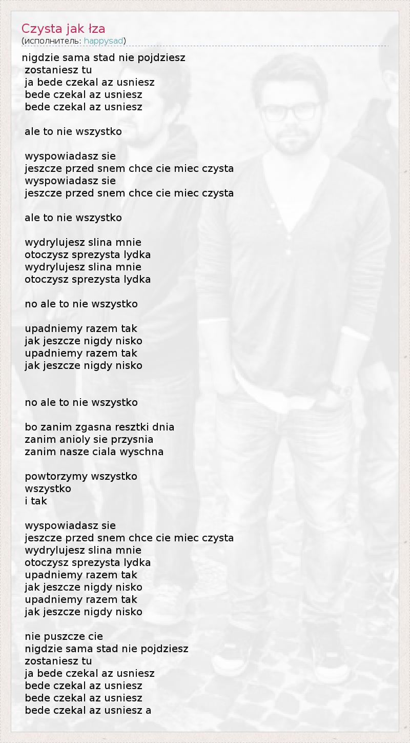 Это интересно:happysad, до 2001 HCKF образовались в городе Skarżysko-Kamienna, Польша. Члены группы были знакомы с 1994, но они решились создать “happysad” лишь в конце 2001. В июле 2004 happysad дебютировал с компакт-диском „Wszystko Jedno”, который был издан SP Records.Музыка happysad главным образом состоит из мелодичного рока, с элементами панка и регги, с характерной лирикой. В одном 2004 группа дала больше 150 концертов, включая поддержку... продолжение
