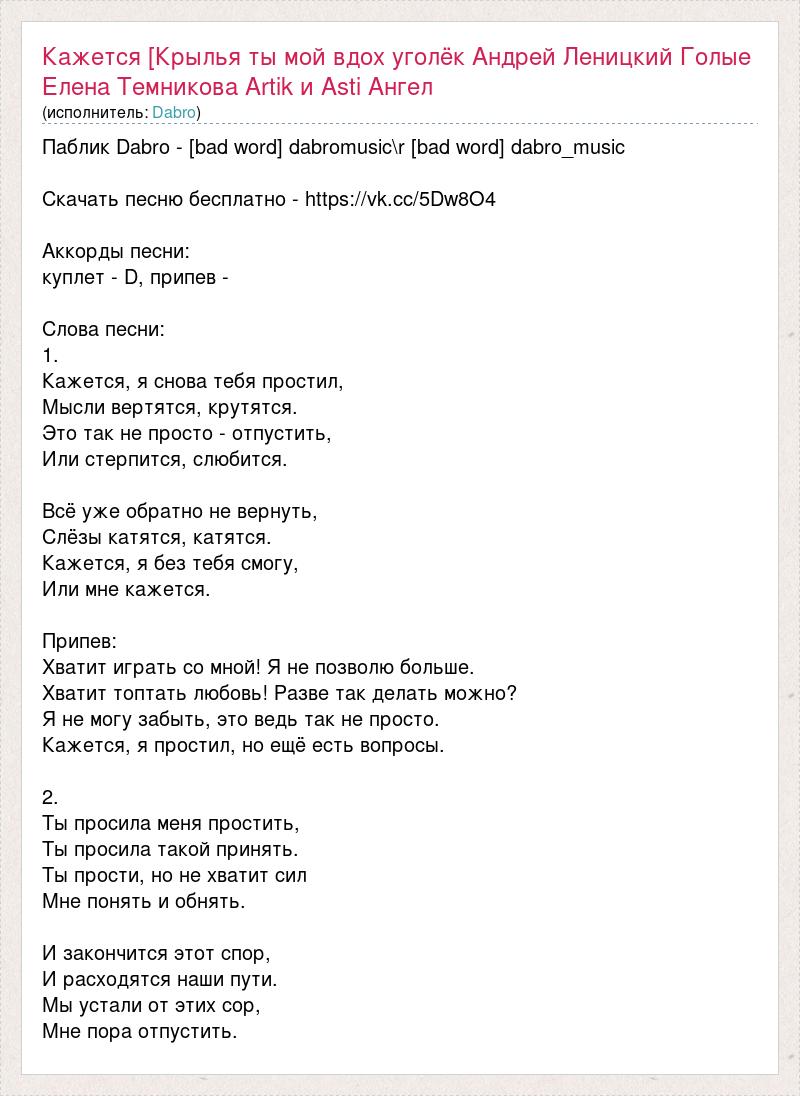 ГлавнаяИсполнителиDabroКажется [Крылья ты мой вдох уголёк Андрей Леницкий Голые Елена Темникова Ar