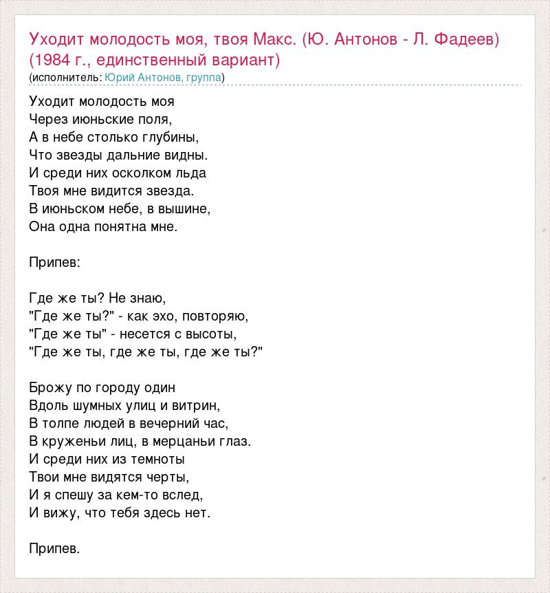 ГлавнаяИсполнителиЮрий Антонов, группаУходит молодость моя, твоя Макс. (Ю. Антонов - Л. Фадеев) (1984 г., единственн