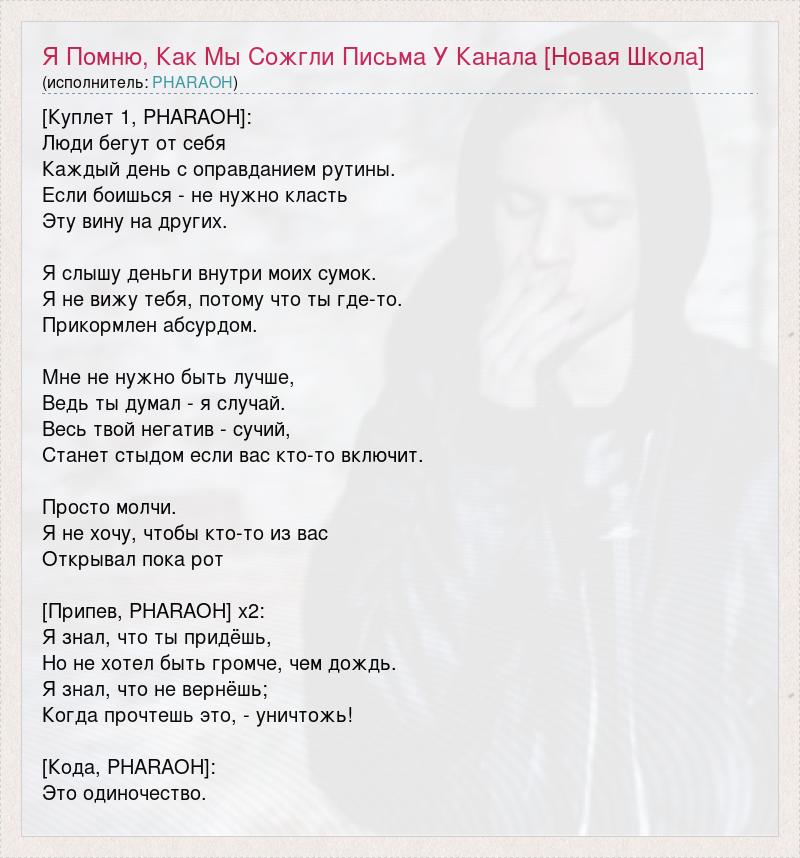 ГлавнаяИсполнителиPharaohЯ Помню, Как Мы Сожгли Письма У Канала [Новая Школа]