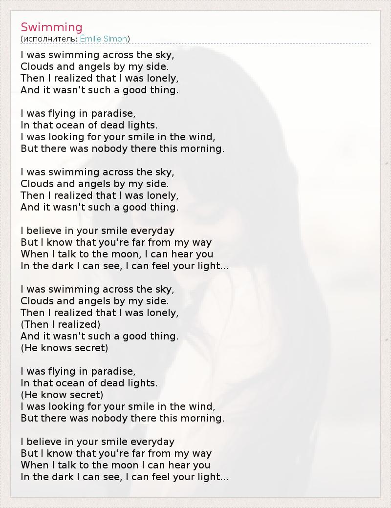 Я плыла по небу, Облака и ангелы сопровождали меня. Затем я осознала, что одинока, И это не так хорошо. Я плыла в раю, В этом океане мёртвого света. Я искала твою улыбку в порывах ветра, Но никого не было рядом этим утром. Я плыла по небу, Облака и ангелы сопровождали меня. Затем я осознала, что одинока, И это не так хорошо. Я верю в твою улыбку каждый день, Но я знаю, что ты так далёк от меня. Когда я говорю с луной, я могу слышать тебя, И во тьме, я могу видеть, я могу чувствовать твой свет... Я плыла по небу, Облака и ангелы сопровождали меня. Затем я осознала, что одинока, (Затем, я осознала) И это не так хорошо. (Он знает тайну) Я плыла в раю, В этом океане мёртвого света. (Он знает тайну) Я искала твою улыбку в порывах ветра, Но никого не было рядом этим утром. Я верю в твою улыбку каждый день, Но я знаю, что ты так далёк от меня. Когда я говорю с луной, я могу слышать тебя, И во тьме, я могу видеть, я могу чувствовать твой свет...