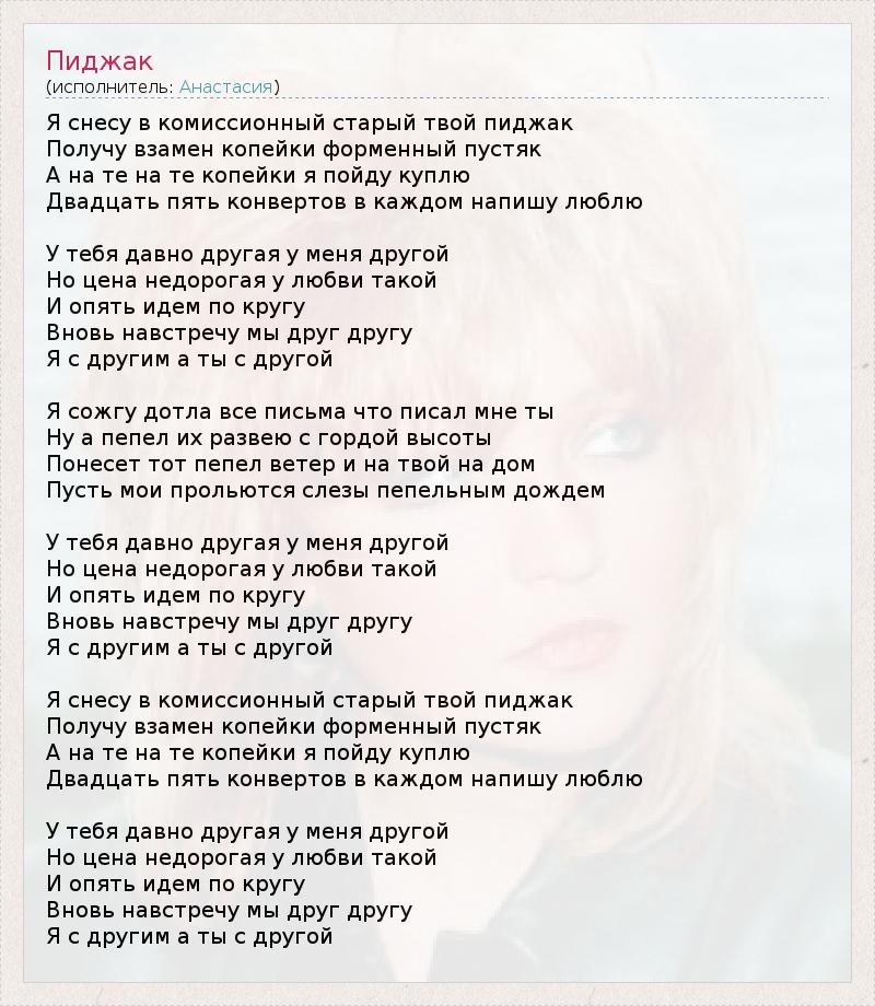 Я снесу в комиссионный старый твой пиджак Получу взамен копейки форменный пустяк А на те на те копейки я пойду куплю Двадцать пять конвертов в каждом напишу люблю У тебя давно другая у меня другой Но цена недорогая у любви такой И опять идем по кругу Вновь навстречу мы друг другу Я с другим а ты с другой Я сожгу дотла все письма что писал мне ты Ну а пепел их развею с гордой высоты Понесет тот пепел ветер и на твой на дом Пусть мои прольются слезы пепельным дождем У тебя давно другая у меня другой Но цена недорогая у любви такой И опять идем по кругу Вновь навстречу мы друг другу Я с другим а ты с другой Я снесу в комиссионный старый твой пиджак Получу взамен копейки форменный пустяк А на те на те копейки я пойду куплю Двадцать пять конвертов в каждом напишу люблю У тебя давно другая у меня другой Но цена недорогая у любви такой И опять идем по кругу Вновь навстречу мы друг другу Я с другим а ты с другой