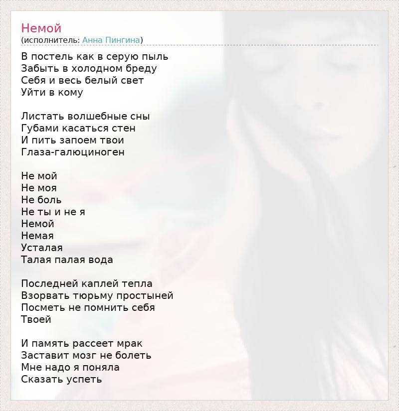 В постель как в серую пыль Забыть в холодном бреду Себя и весь белый свет Уйти в кому Листать волшебные сны Губами касаться стен И пить запоем твои Глаза-галюциноген Не мой Не моя Не боль Не ты и не я Немой Немая Усталая Талая палая вода Последней каплей тепла Взорвать тюрьму простыней Посметь не помнить себя Твоей И память рассеет мрак Заставит мозг не болеть Мне надо я поняла Сказать успеть