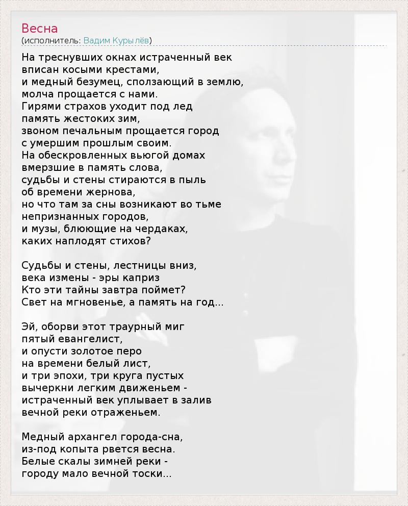 На треснувших окнах истраченный век вписан косыми крестами, и медный безумец, сползающий в землю, молча прощается с нами. Гирями страхов уходит под лед память жестоких зим, звоном печальным прощается город с умершим прошлым своим. На обескровленных вьюгой домах вмерзшие в память слова, судьбы и стены стираются в пыль об времени жернова, но что там за сны возникают во тьме непризнанных городов, и музы, блюющие на чердаках, каких наплодят стихов? Судьбы и стены, лестницы вниз, века измены - эры каприз Кто эти тайны завтра поймет? Свет на мгновенье, а память на год... Эй, оборви этот траурный миг пятый евангелист, и опусти золотое перо на времени белый лист, и три эпохи, три круга пустых вычеркни легким движеньем - истраченный век уплывает в залив вечной реки отраженьем. Медный архангел города-сна, из-под копыта рвется весна. Белые скалы зимней реки - городу мало вечной тоски...