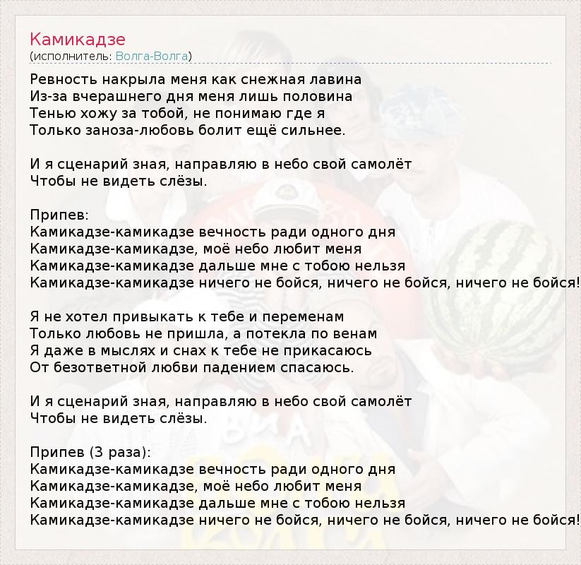Ревность накрыла меня как снежная лавина Из-за вчерашнего дня меня лишь половина Тенью хожу за тобой, не понимаю где я Только заноза-любовь болит ещё сильнее. И я сценарий зная, направляю в небо свой самолёт Чтобы не видеть слёзы. Припев: Камикадзе-камикадзе вечность ради одного дня Камикадзе-камикадзе, моё небо любит меня Камикадзе-камикадзе дальше мне с тобою нельзя Камикадзе-камикадзе ничего не бойся, ничего не бойся, ничего не бойся! Я не хотел привыкать к тебе и переменам Только любовь не пришла, а потекла по венам Я даже в мыслях и снах к тебе не прикасаюсь От безответной любви падением спасаюсь. И я сценарий зная, направляю в небо свой самолёт Чтобы не видеть слёзы. Припев (3 раза): Камикадзе-камикадзе вечность ради одного дня Камикадзе-камикадзе, моё небо любит меня Камикадзе-камикадзе дальше мне с тобою нельзя Камикадзе-камикадзе ничего не бойся, ничего не бойся, ничего не бойся!