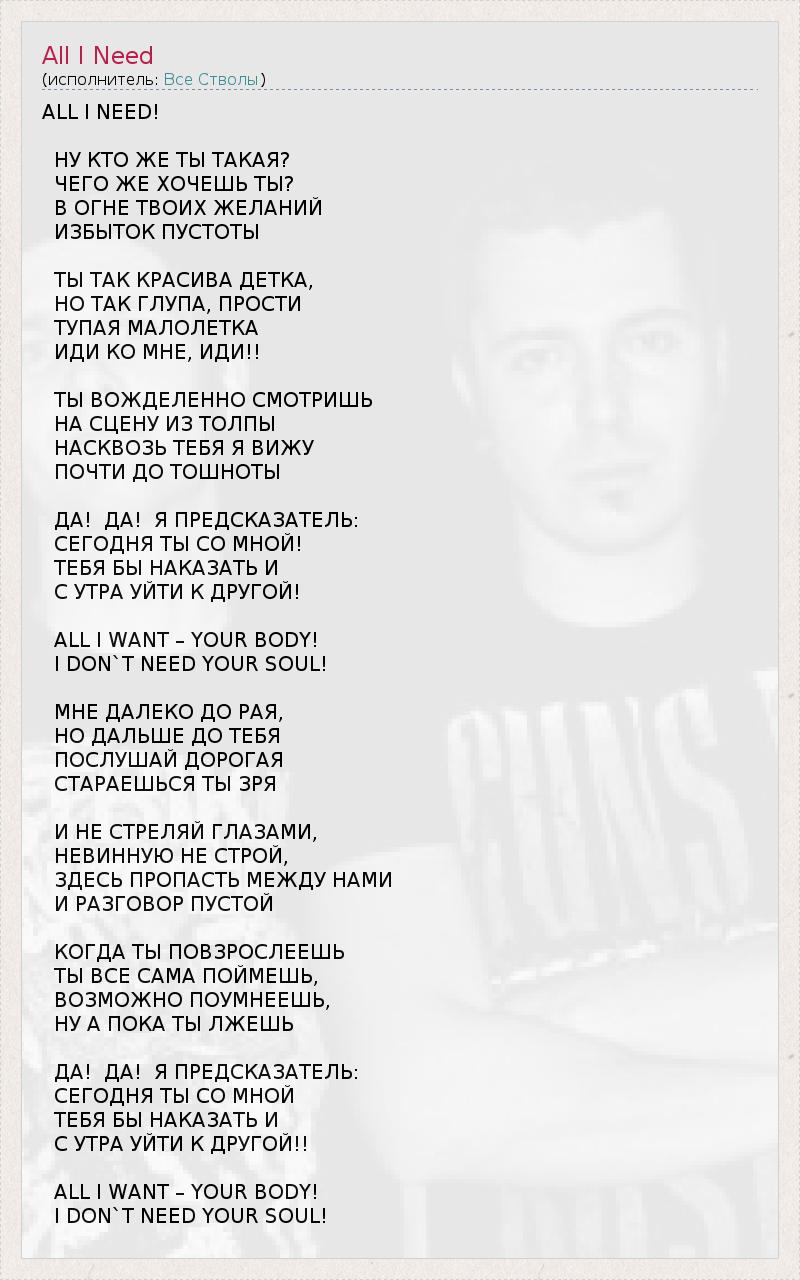 ALL I NEED! НУ КТО ЖЕ ТЫ ТАКАЯ? ЧЕГО ЖЕ ХОЧЕШЬ ТЫ? В ОГНЕ ТВОИХ ЖЕЛАНИЙ ИЗБЫТОК ПУСТОТЫ ТЫ ТАК КРАСИВА ДЕТКА, НО ТАК ГЛУПА, ПРОСТИ ТУПАЯ МАЛОЛЕТКА ИДИ КО МНЕ, ИДИ!! ТЫ ВОЖДЕЛЕННО СМОТРИШЬ НА СЦЕНУ ИЗ ТОЛПЫ НАСКВОЗЬ ТЕБЯ Я ВИЖУ ПОЧТИ ДО ТОШНОТЫ ДА! ДА! Я ПРЕДСКАЗАТЕЛЬ: СЕГОДНЯ ТЫ СО МНОЙ! ТЕБЯ БЫ НАКАЗАТЬ И С УТРА УЙТИ К ДРУГОЙ! ALL I WANT – YOUR BODY! I DON`T NEED YOUR SOUL! МНЕ ДАЛЕКО ДО РАЯ, НО ДАЛЬШЕ ДО ТЕБЯ ПОСЛУШАЙ ДОРОГАЯ СТАРАЕШЬСЯ ТЫ ЗРЯ И НЕ СТРЕЛЯЙ ГЛАЗАМИ, НЕВИННУЮ НЕ СТРОЙ, ЗДЕСЬ ПРОПАСТЬ МЕЖДУ НАМИ И РАЗГОВОР ПУСТОЙ КОГДА ТЫ ПОВЗРОСЛЕЕШЬ ТЫ ВСЕ САМА ПОЙМЕШЬ, ВОЗМОЖНО ПОУМНЕЕШЬ, НУ А ПОКА ТЫ ЛЖЕШЬ ДА! ДА! Я ПРЕДСКАЗАТЕЛЬ: СЕГОДНЯ ТЫ СО МНОЙ ТЕБЯ БЫ НАКАЗАТЬ И С УТРА УЙТИ К ДРУГОЙ!! ALL I WANT – YOUR BODY! I DON`T NEED YOUR SOUL!