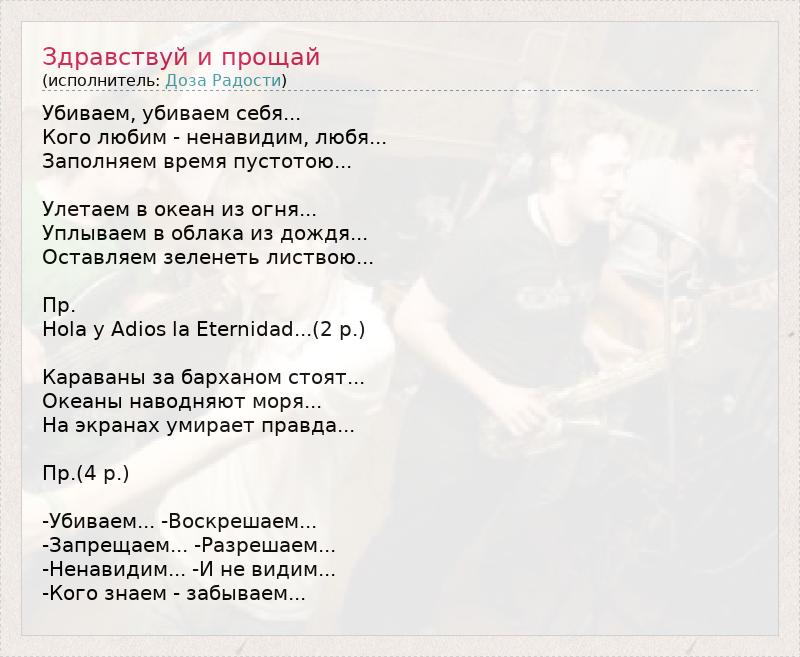 Убиваем, убиваем себя... Кого любим - ненавидим, любя... Заполняем время пустотою... Улетаем в океан из огня... Уплываем в облака из дождя... Оставляем зеленеть листвою... Пр. Hola y Adios la Eternidad...(2 р.) Караваны за барханом стоят... Океаны наводняют моря... На экранах умирает правда... Пр.(4 р.) -Убиваем... -Воскрешаем... -Запрещаем... -Разрешаем... -Ненавидим... -И не видим... -Кого знаем - забываем...